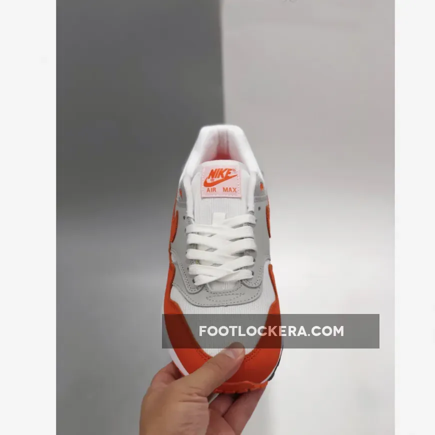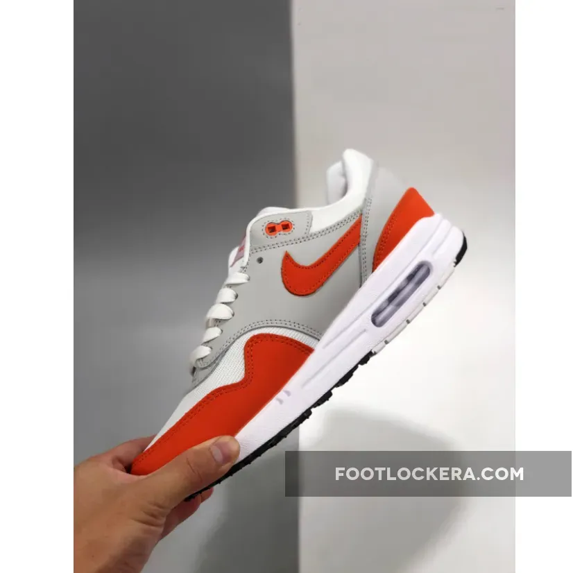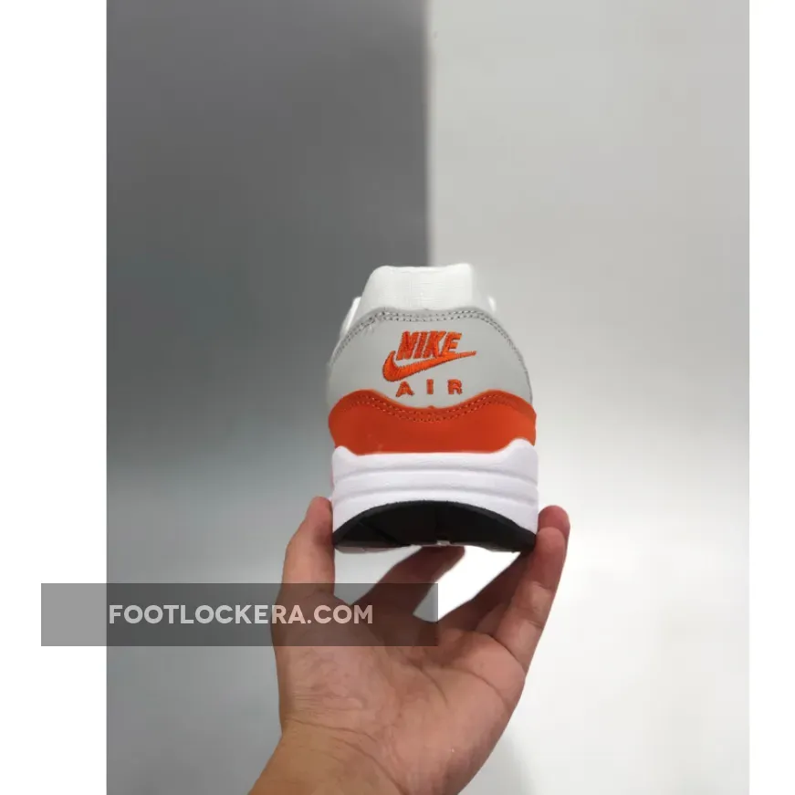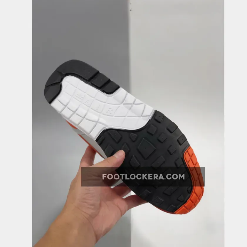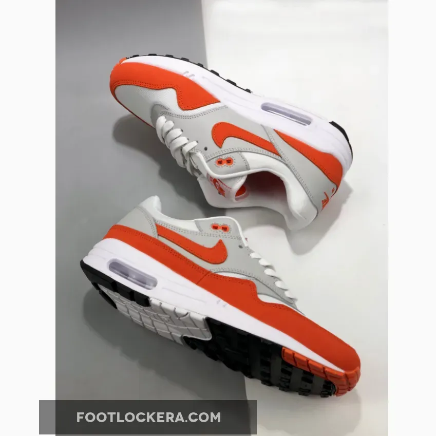 This offering of the Nike Air Max 1 features a White mesh base with Grey overlays on the sides, forefoot, and heel. Highlighting the shoe are Orange accents on the tongue, Swoosh, upper eyelets, mudguard and toe portion of the sole. A White midsole atop a Black/White rubber outsole completes the design.