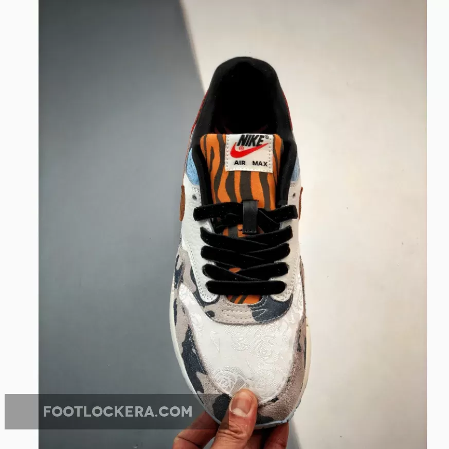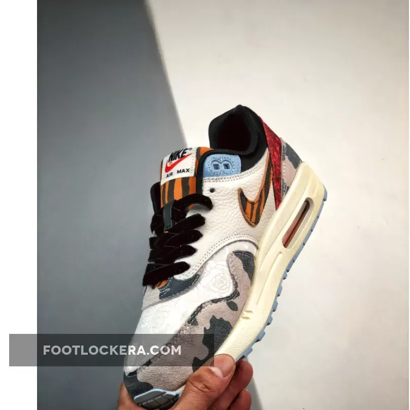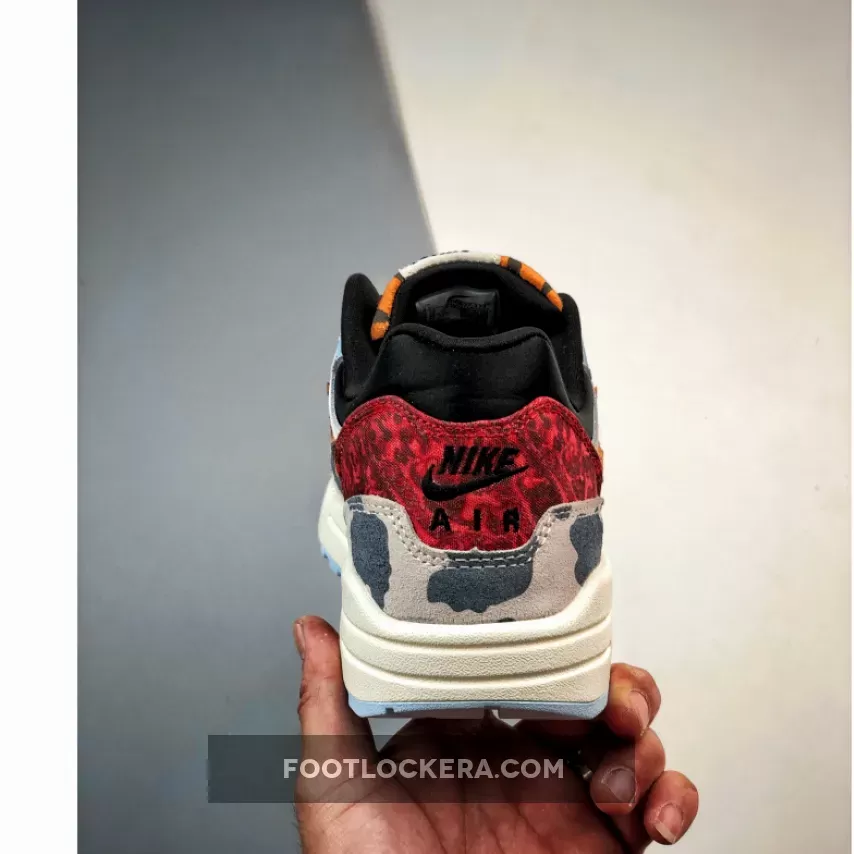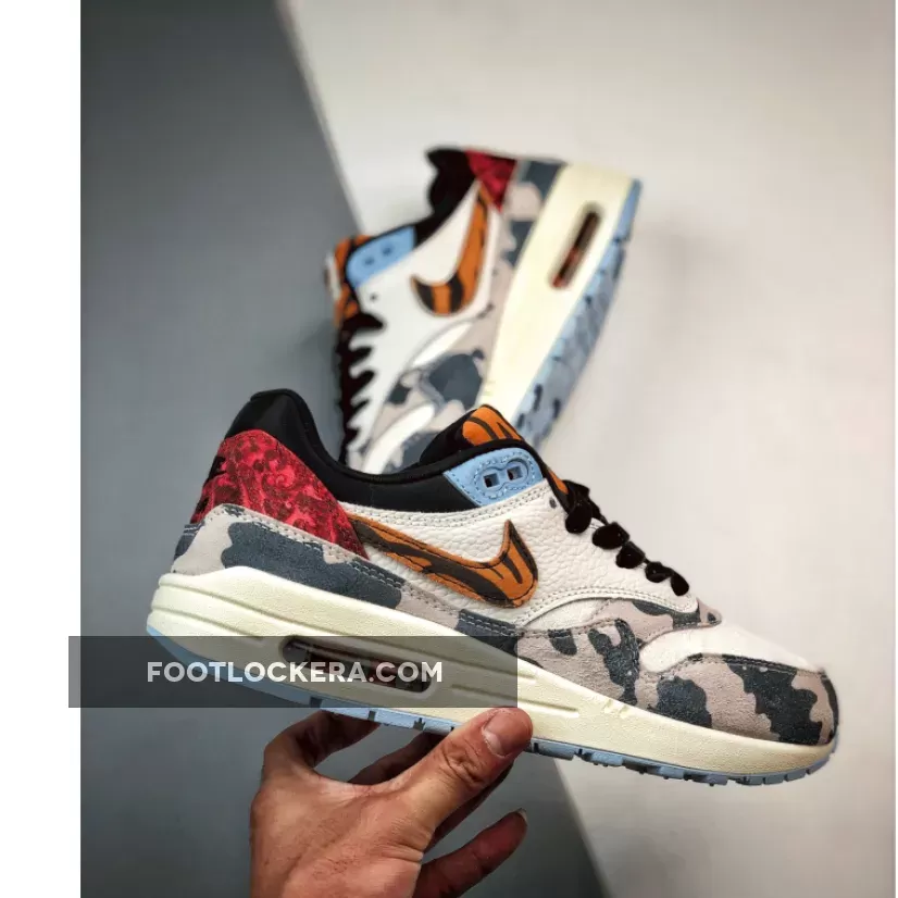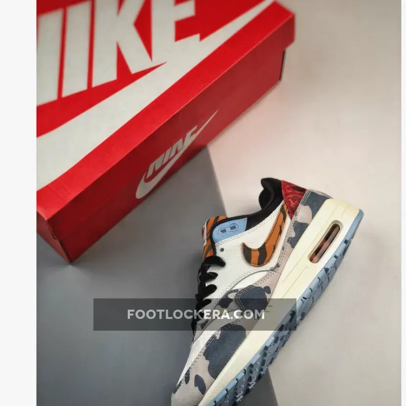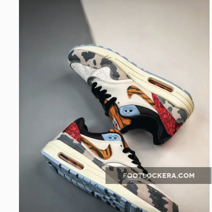 this offering of the Nike Air Max 1 comes constructed in a mix of materials highlighted with tiger stripes and cow prints. Other notable details includes satin liners, velvet laces, embroidered paisley-like toe box and heels atop a Sail midsole and Light Blue rubber outsole.