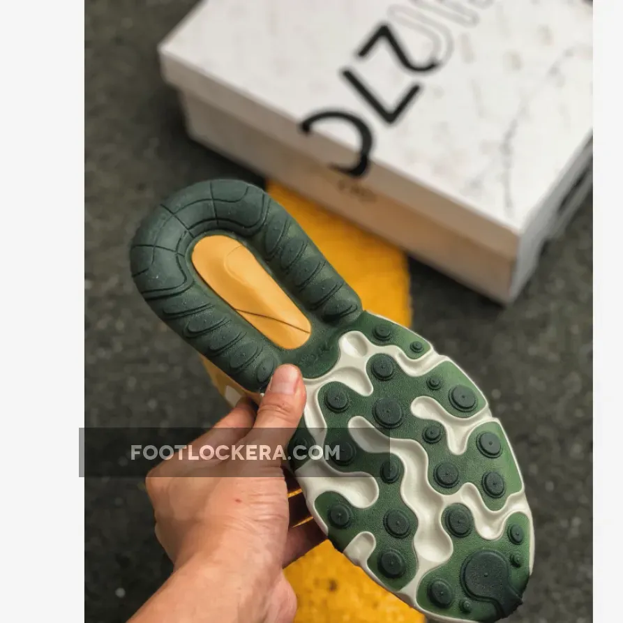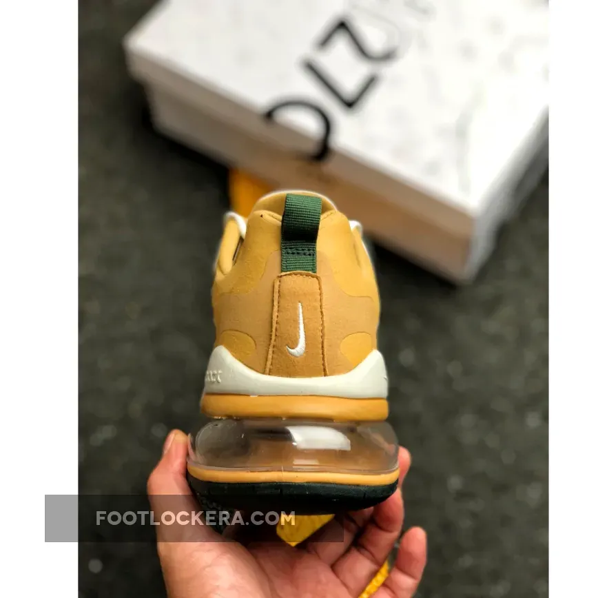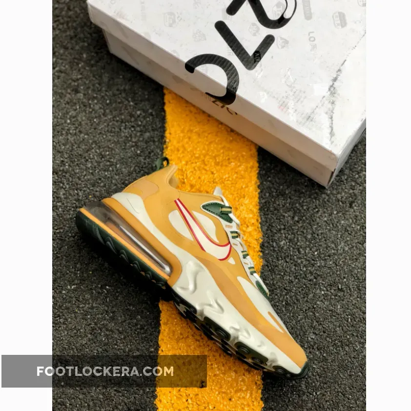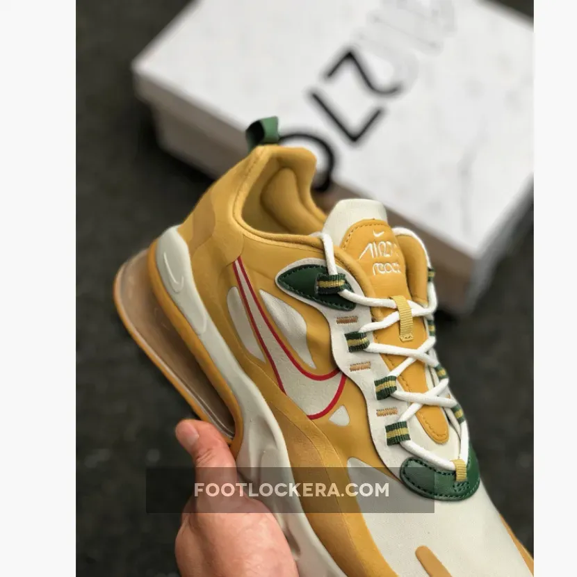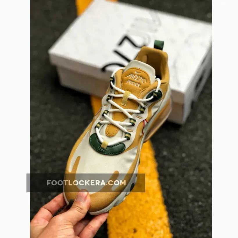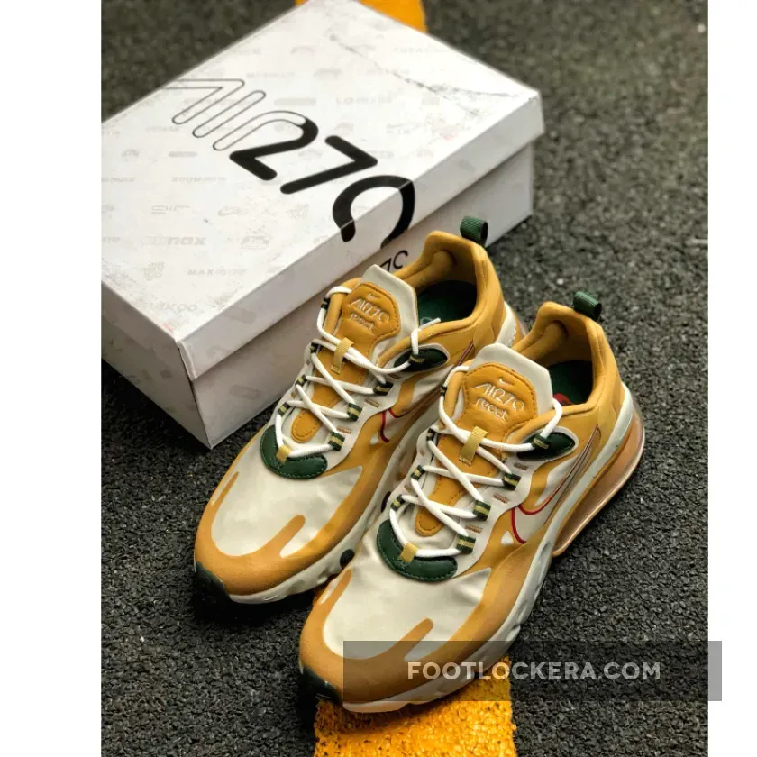 Painted in Gold, White, Red and Green colour combination is the brand new Air Max 270 React. This rendition of the sneaker is mirroring the transformation of leaves in the Fall time with the tones of Gold, Green and Red on the contemporary designs. The top of the sneaker features Synthetic material with suede overlays. Moreover, the sneaker includes Neoprene-mesh tongue with lace-up closure. Down below the sneaker, we have the foam midsole with airbag unit for lightweight support and comfort. Finishing off the design for this brand new Air Max 270 React is the Rubber outsole that provides traction and stability.