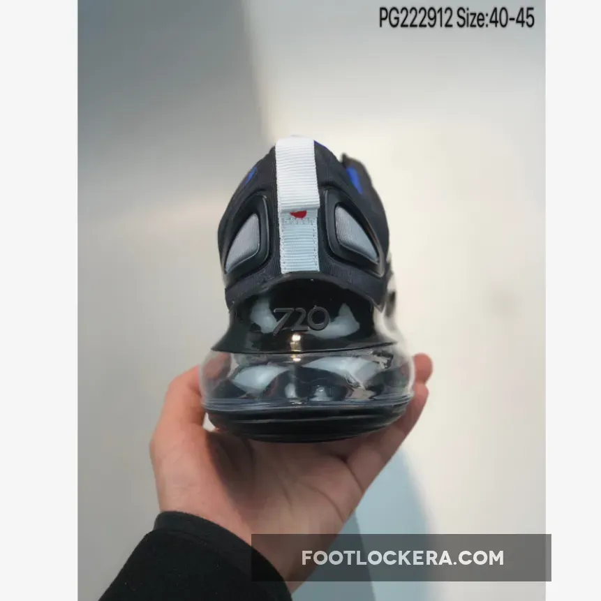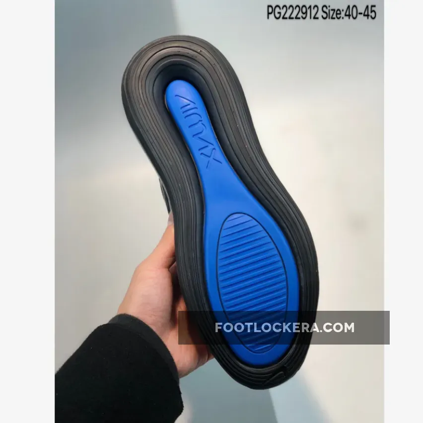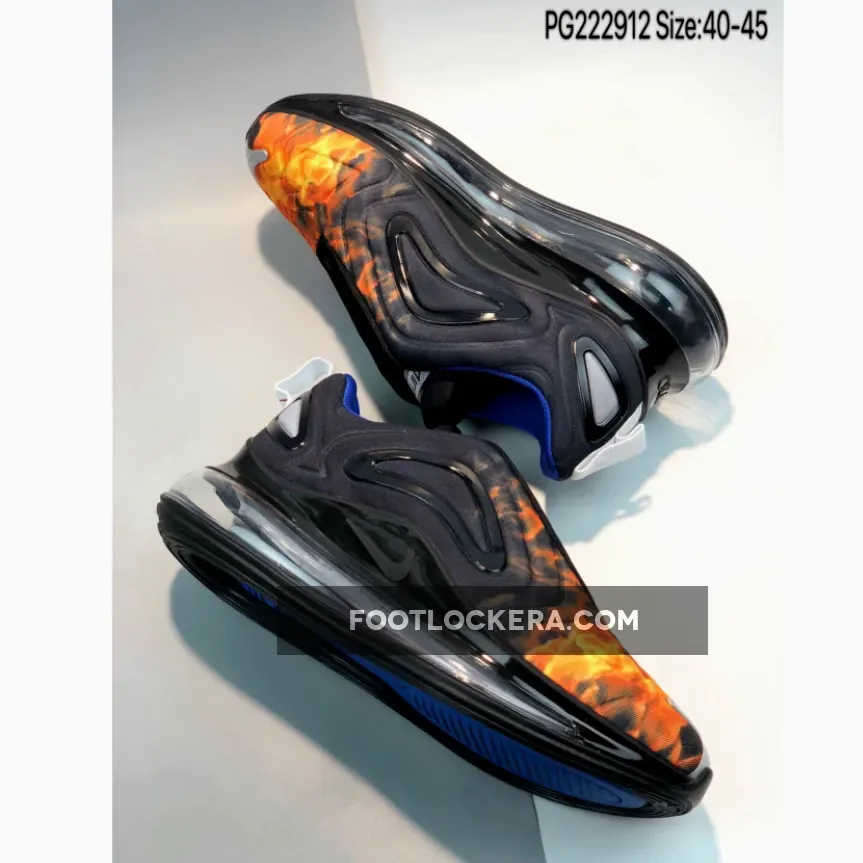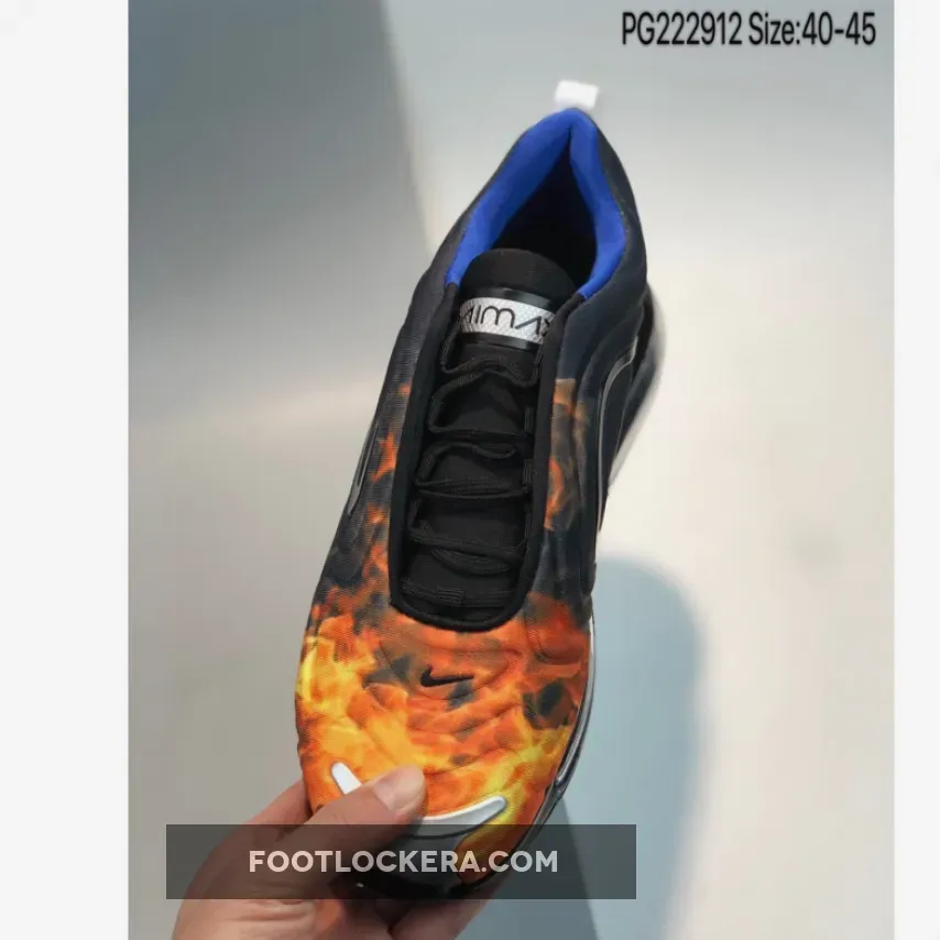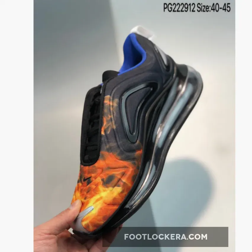 This “Gel” edition of the Nike Air Max 720 is highlighted with a flame graphic covering the toe area and up the tongue. Finishing off the design are dashes on the laces with Blue inner lining.
