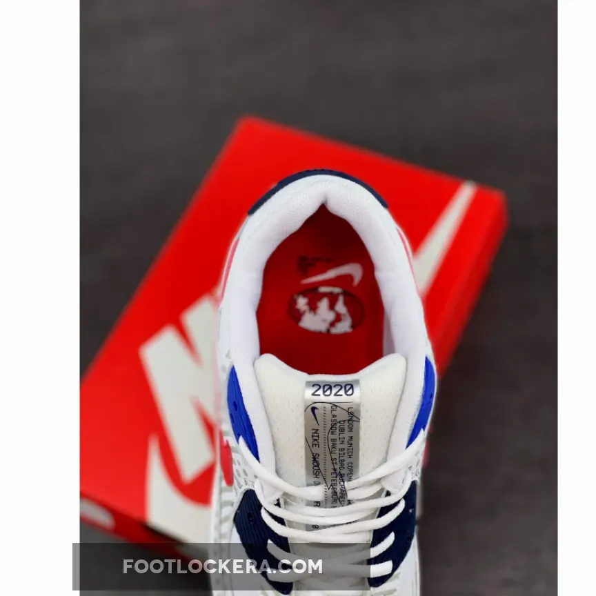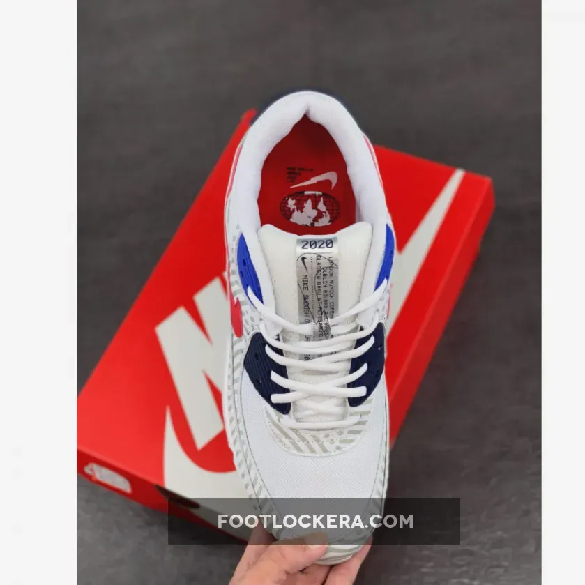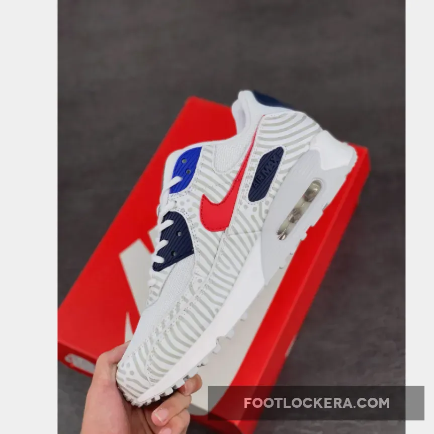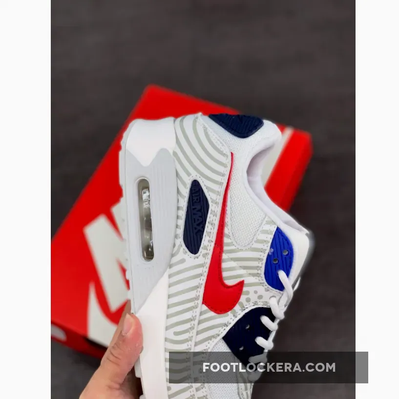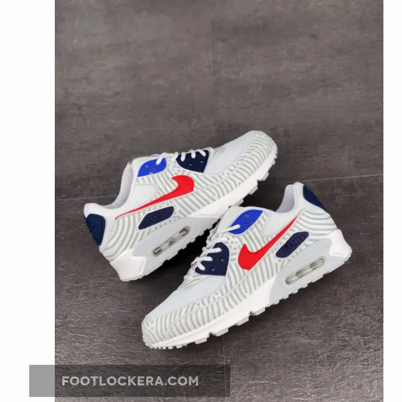 This offering of the Nike Air Max 90 feature a White mesh base with 3M reflective overlays paired with Red leather Swooshes on the sides. Navy and Royal Blue eyelets and branded panels with Silver tongue taping, graphic global insoles atop a White rubber sole completes the design.