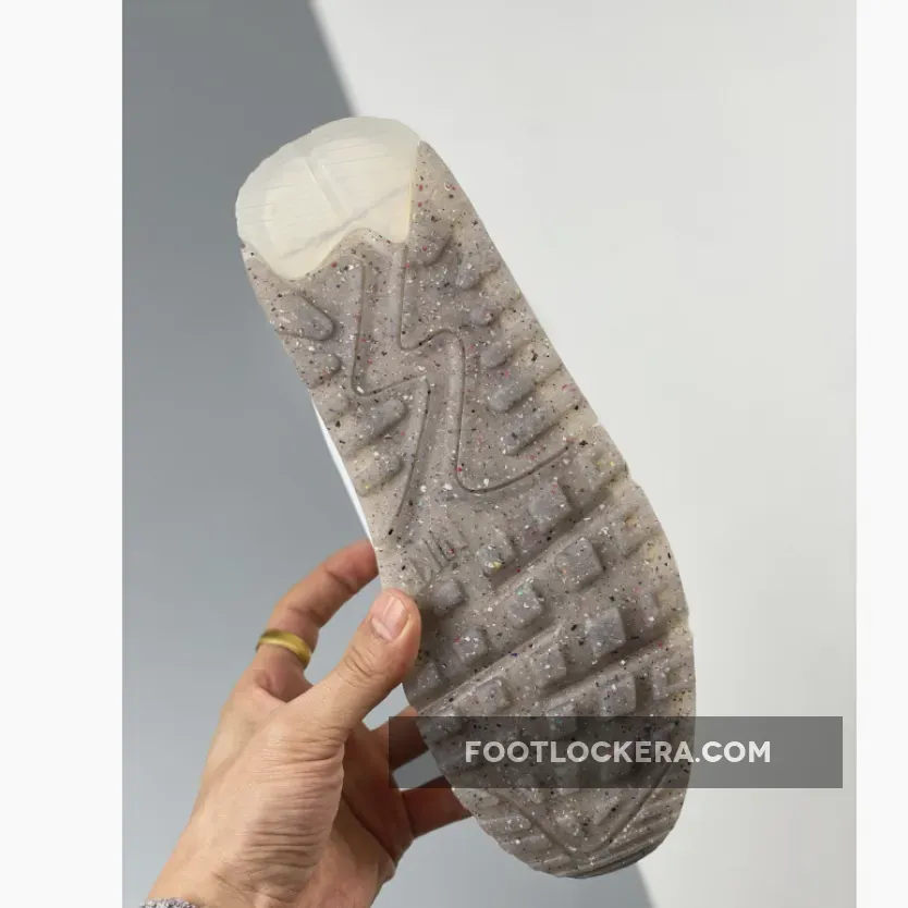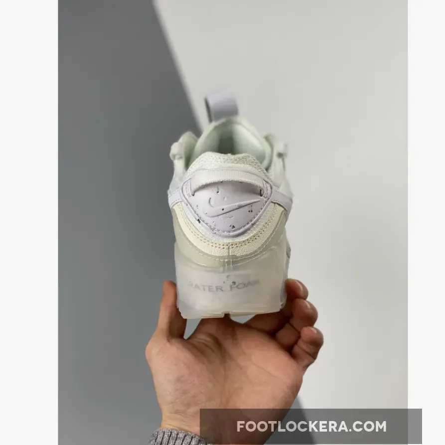 The sustainable Terrascape line of the Tinker Hatfield-designed Nike Air Max 90 has a fresh new release in cloud-like hues. Introducing the Nike Air Max 90 Terrascape White Grey. This Air Max 90’s base is white mesh, matching the laces and complemented by recycled material overlays in varying shades of white, including the signature profile Swooshes on the medial and lateral quarters. Nimbus cloud grey semi-translucent TPU eye stay accents and a lighter grey Air Max-stamped mudguard provide neutral contrasts. An icy translucent rubber casing reveals the shoe’s speckled Crater Foam midsoles.