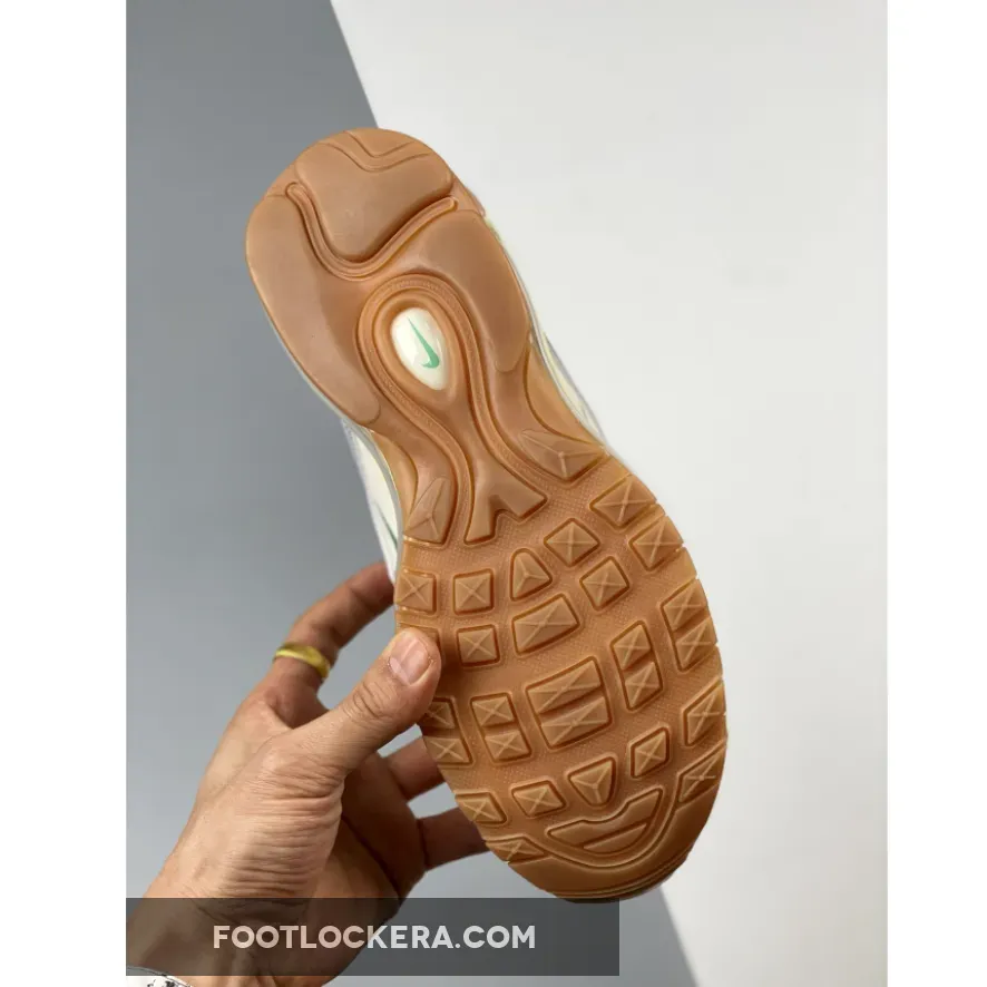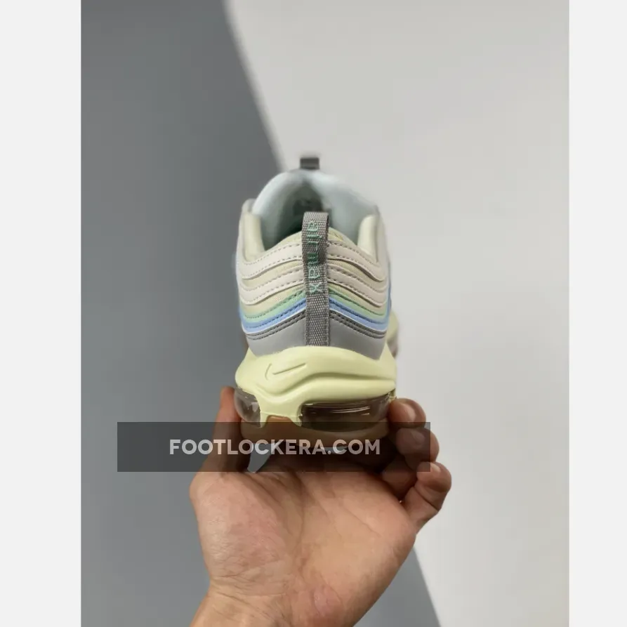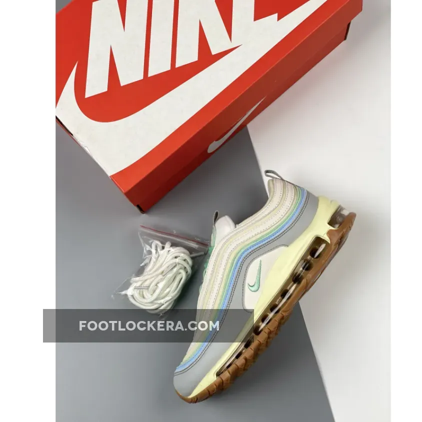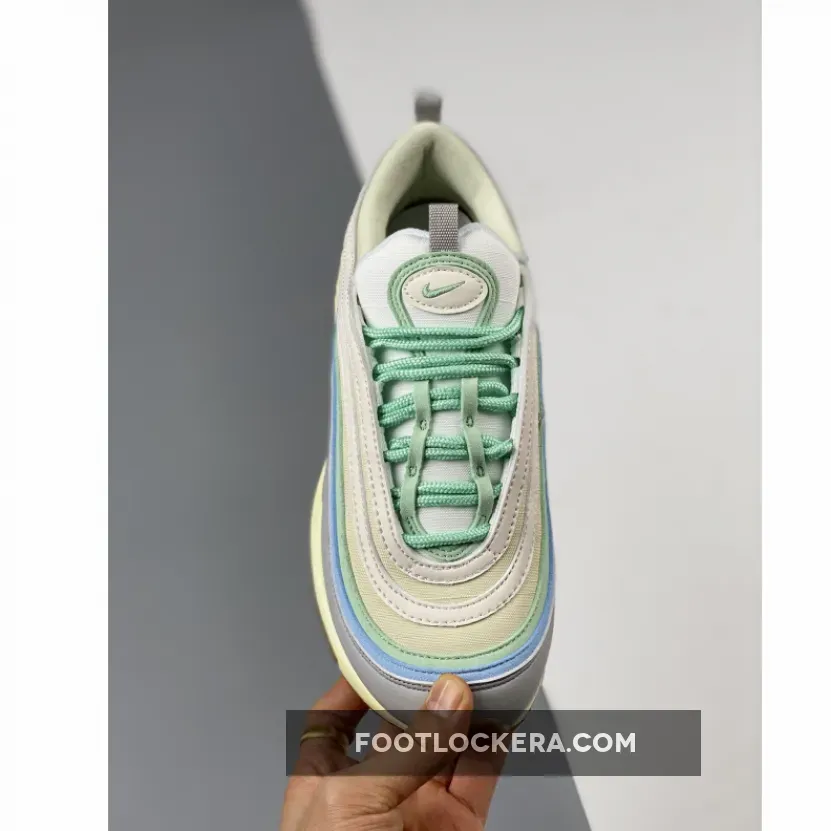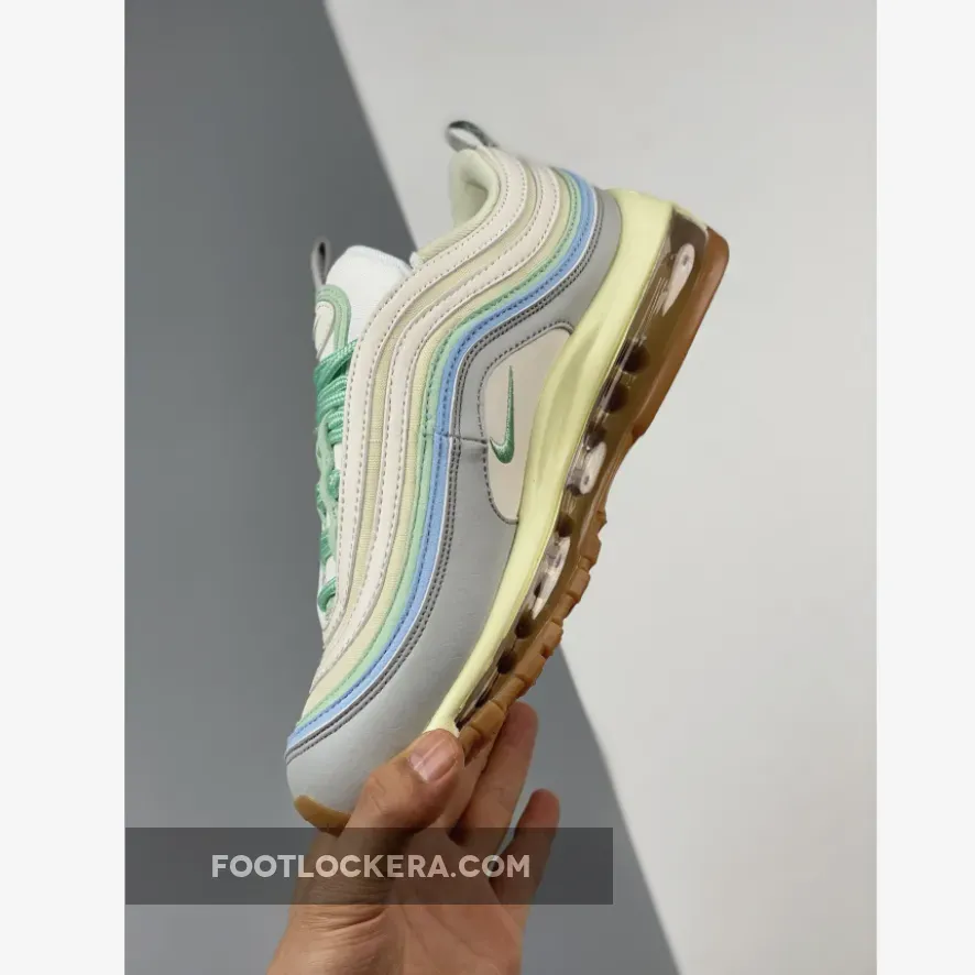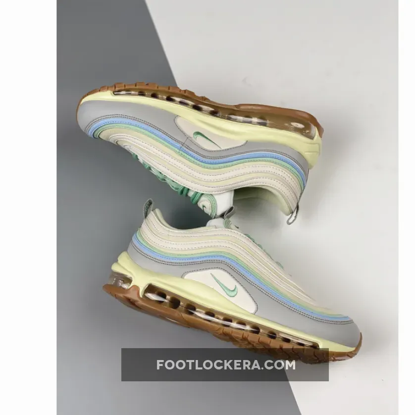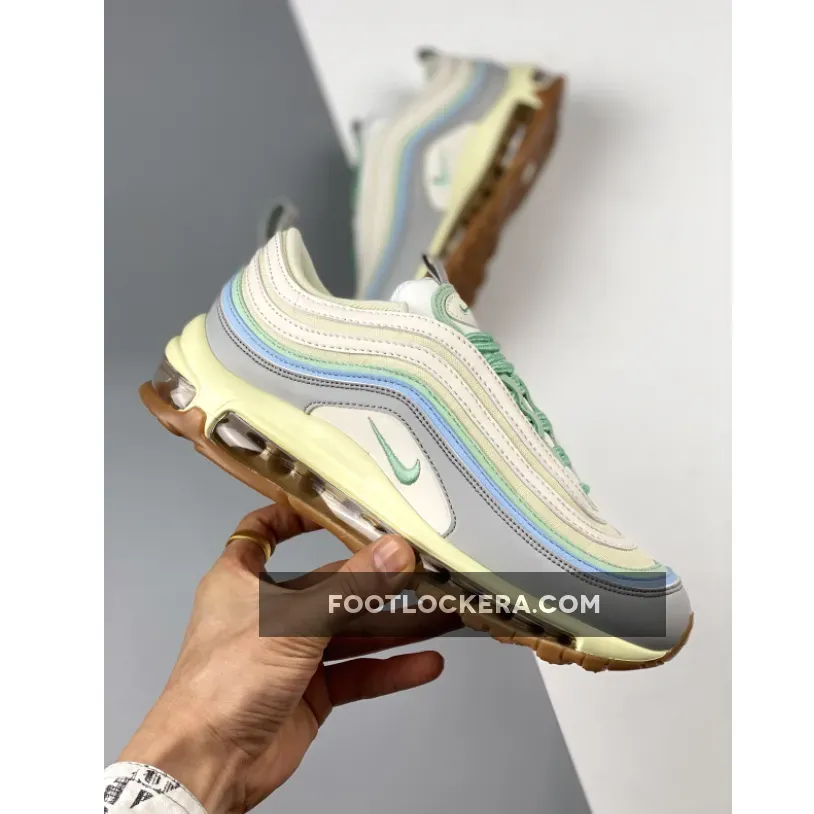 This Nike Air Max 97 gets dressed in airy pastels that features shades of light blue and “Enamel Green.” These are then balanced out by an arrangement of neutrals, with grey outfitting the mudguard, gum the outsole, and a light cream the midsole and much of the upper.The midsole has a slightly aged tint and is complete with a see-through Air unit and gum outsole.