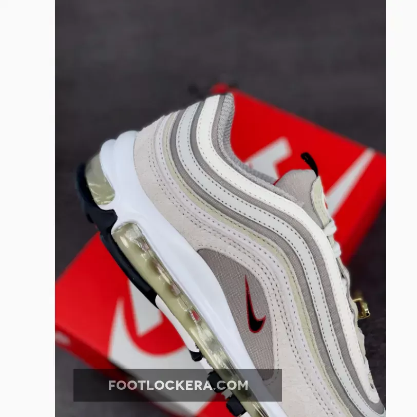 The first layer on the upper is a fuzzy off-white suede wrapping the shoe from heel to toe. This layer alternates with beige and bone-coloured nylon and suede on the signature wavy design of the Air Max 97. The “First Use June 18, 1971” text is featured on the mid-panel window on the medial side. The lateral mid-panel window shows off a mini Swoosh in black with a red outline. The pair also has retro branding on the tongue tab and heel pull tab. The full-length Air unit that has been a feature of the Air Max 97 since its introduction in 1997 remains simple in a clear cassette and white construction. A bejewelled gold deubre finishes the look.