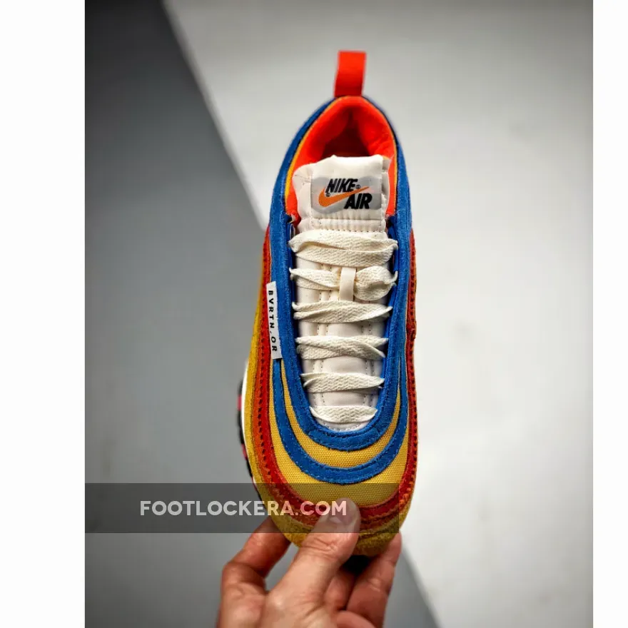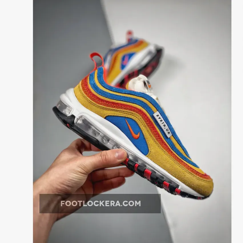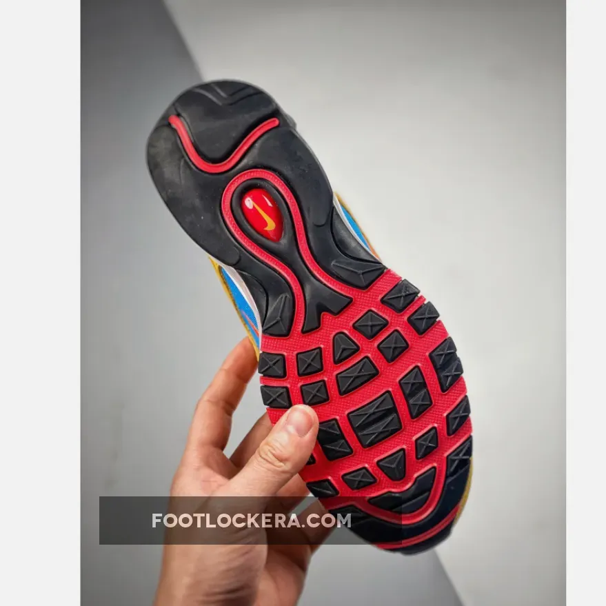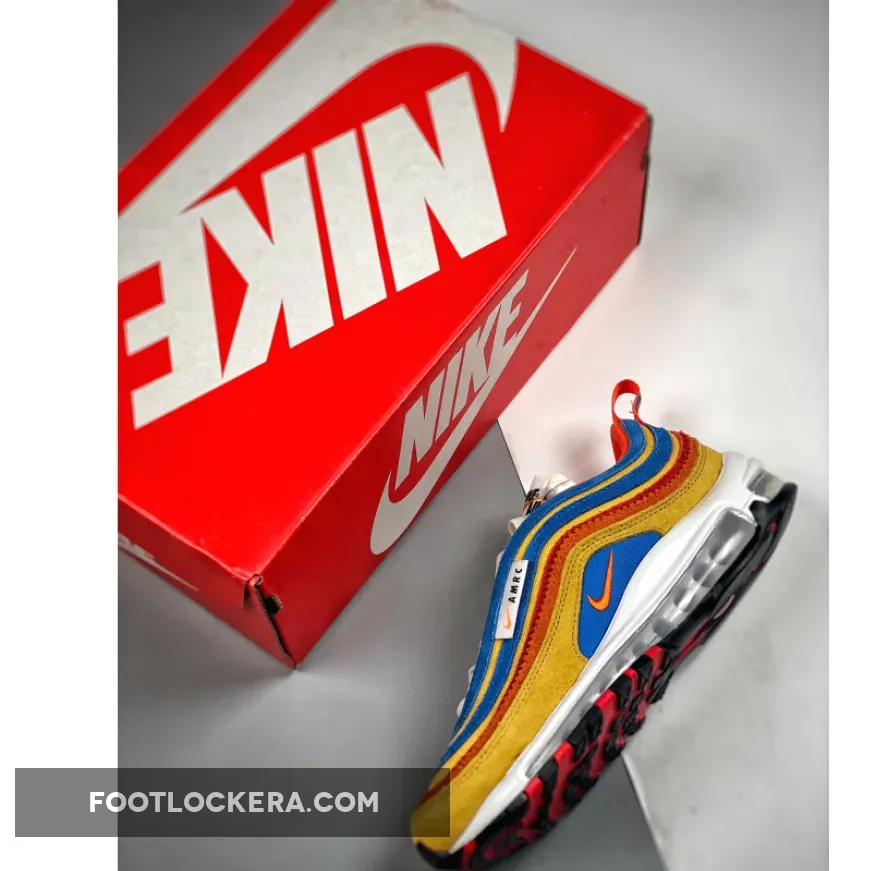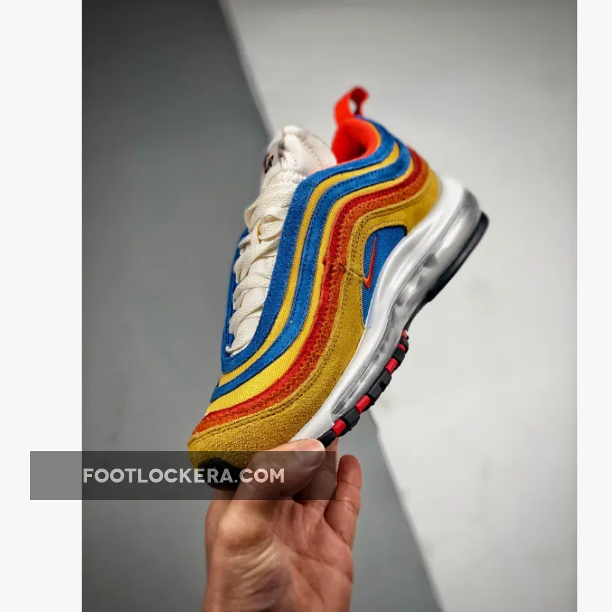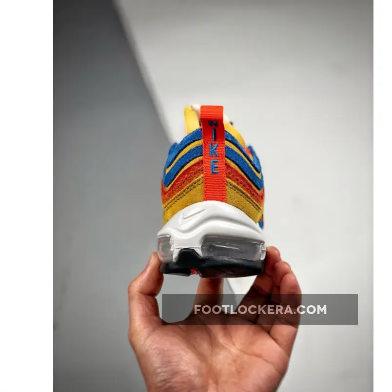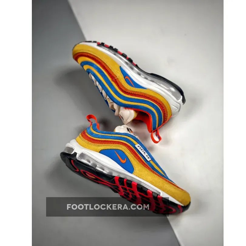 Nike takes it back to the good old days with the Nike Air Max Running Club collection. Joining the pack is the undeniably eye-catching Nike Air Max 97 SE Running Club Yellow Blue. It begins with a carrot-coloured suede base and dressed with the iconic ripple design which now takes on a bright blue and red combination. This same palette extends to the side panels where a red-orange Nike Swoosh sits in a patch of blue background. Amidst the very vibrant modern look are nostalgic details — the most prominent being the exposed foam tongue with the retro Nike Air branding.
