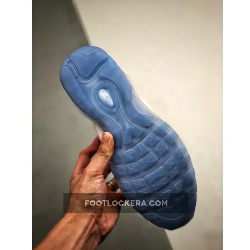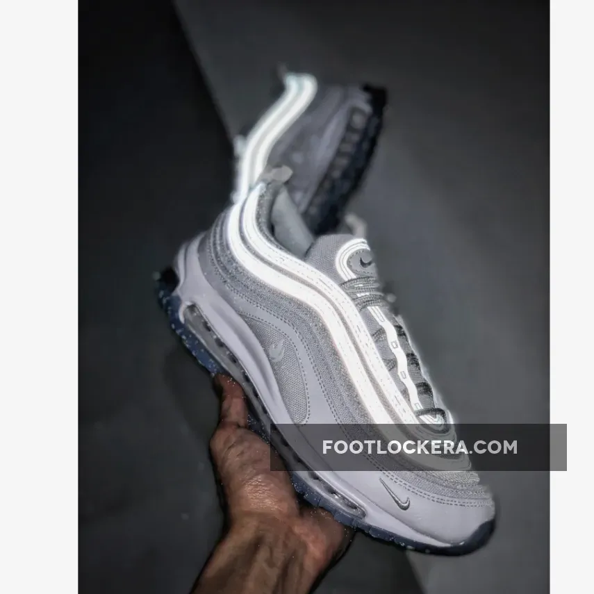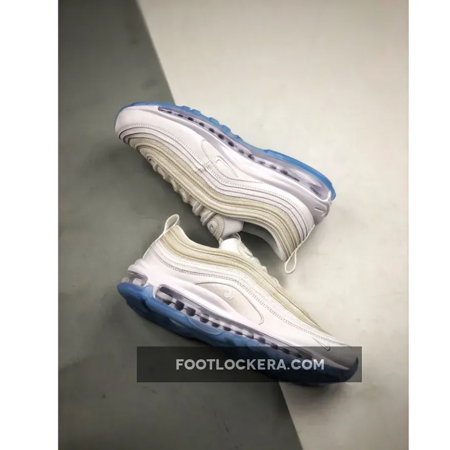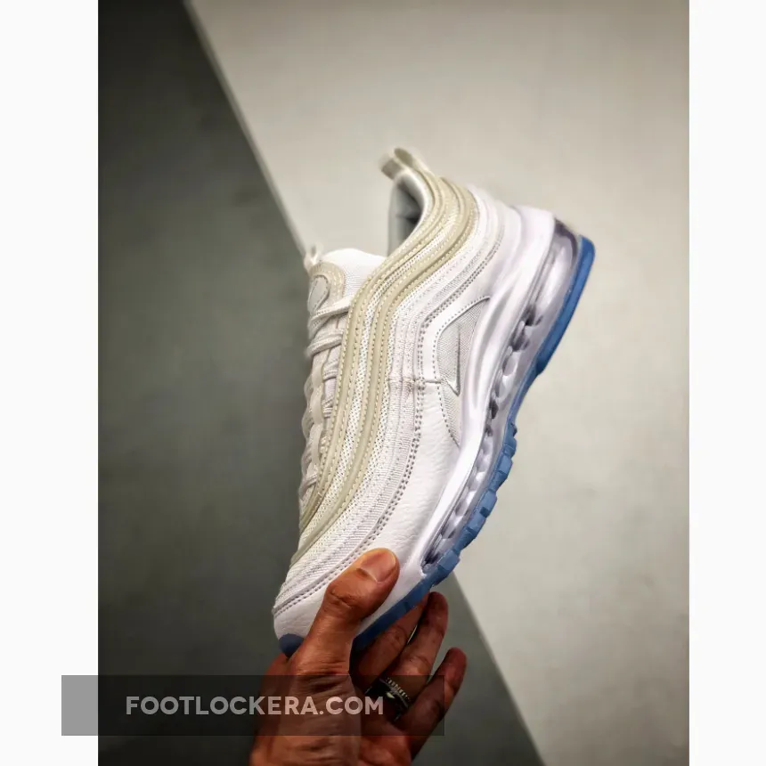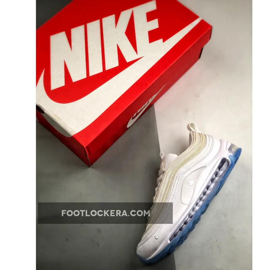 Looking closer this Nike Air Max 97 comes with White mesh across the upper while the same shade covers the tumbled leather overlays. In addition we have a White flame emoji on the mid-panel while just above it is 3M Reflective. Other highlights includes tonal branding and an icy Blue translucent outsole.