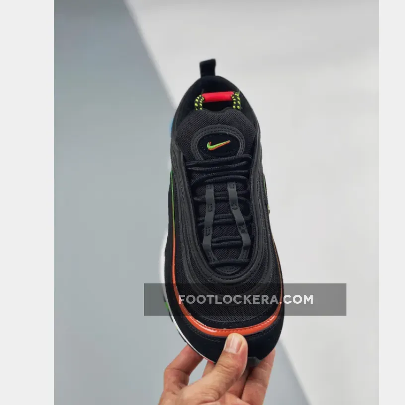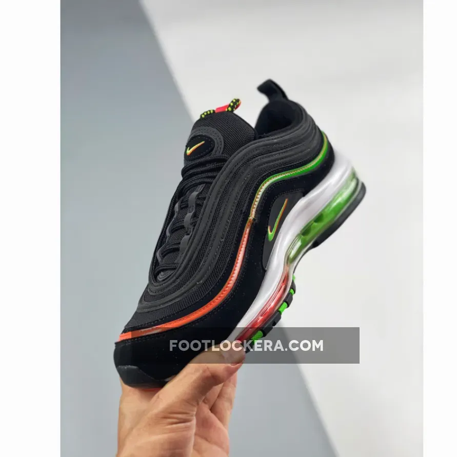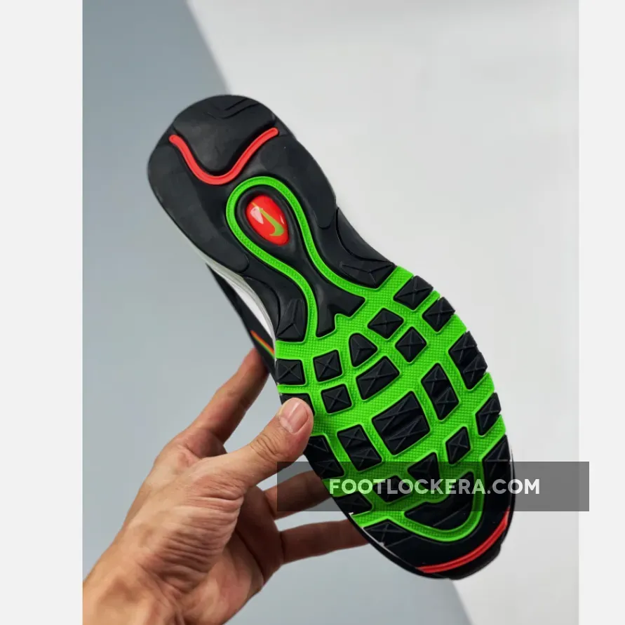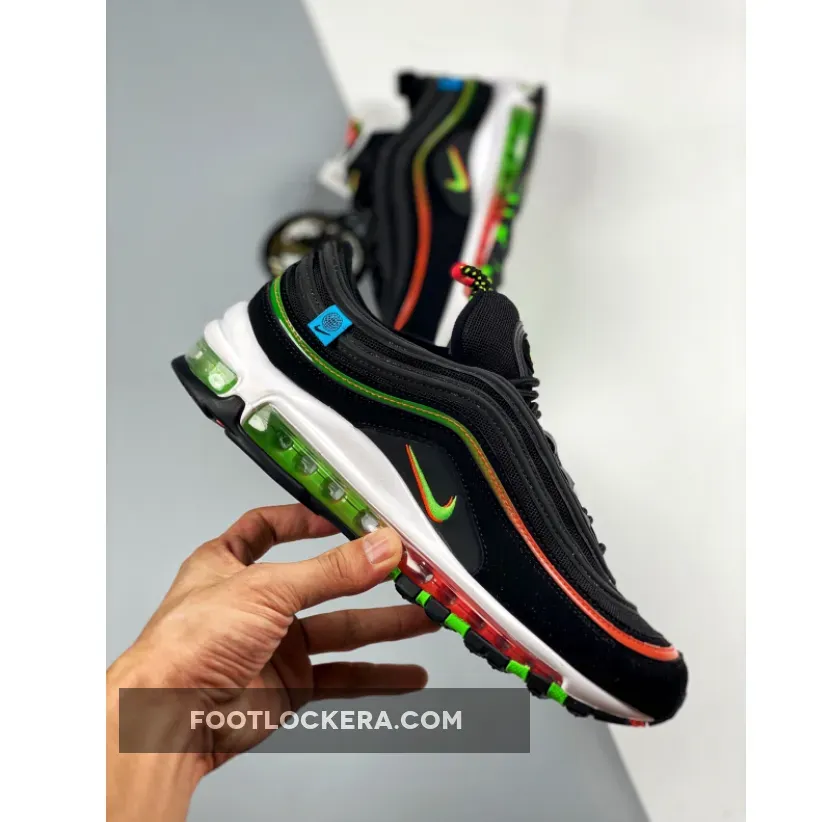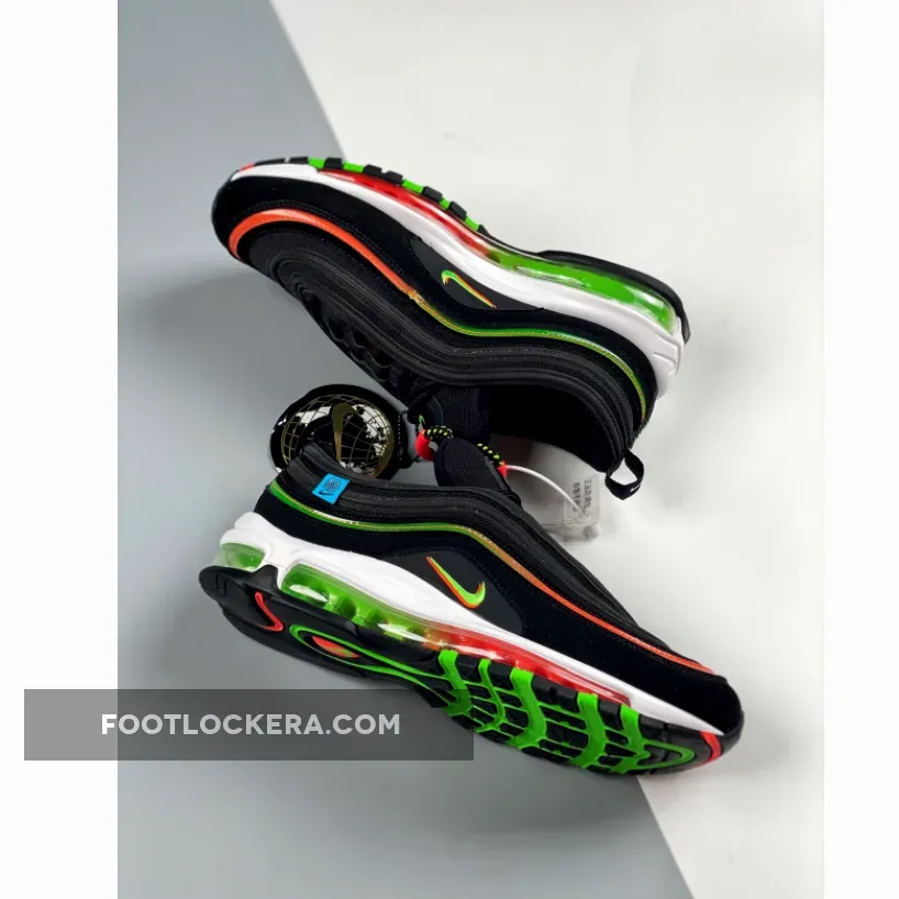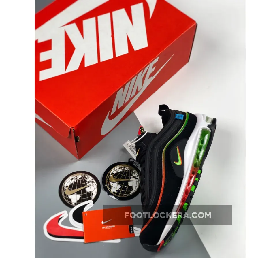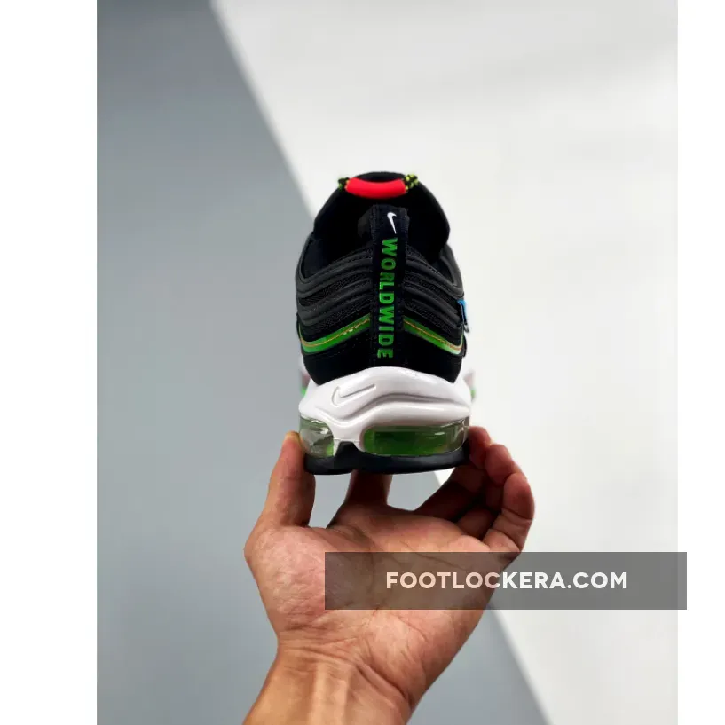 This offering of the Nike Air Max 97 features a Black upper paired with Crimson and Green Strike contrasting accents with a Blue Fury tag on the lateral and “Worldwide” text on the Black heel tab and insole.