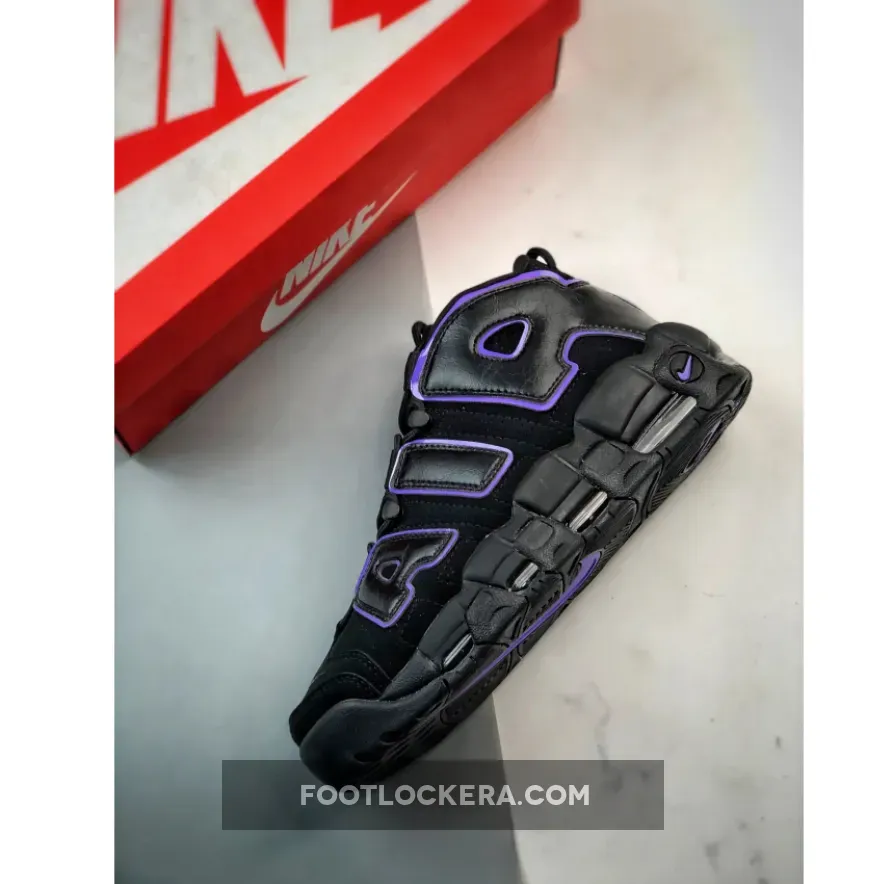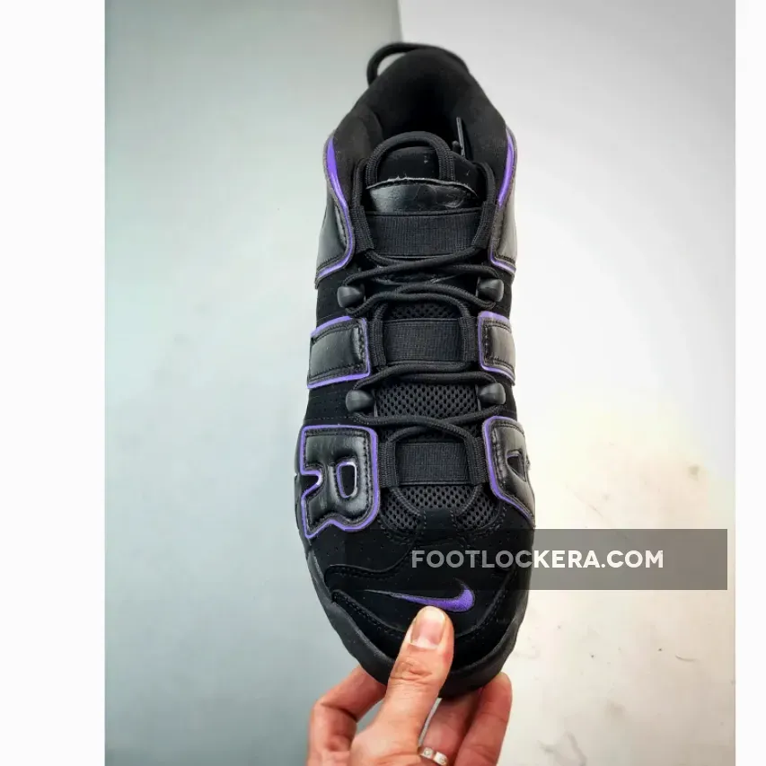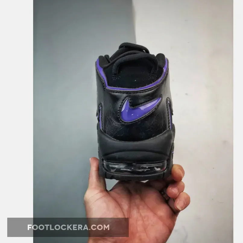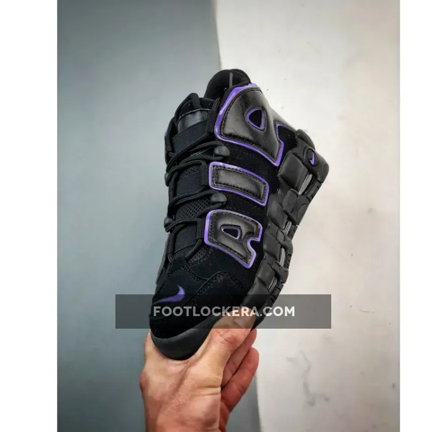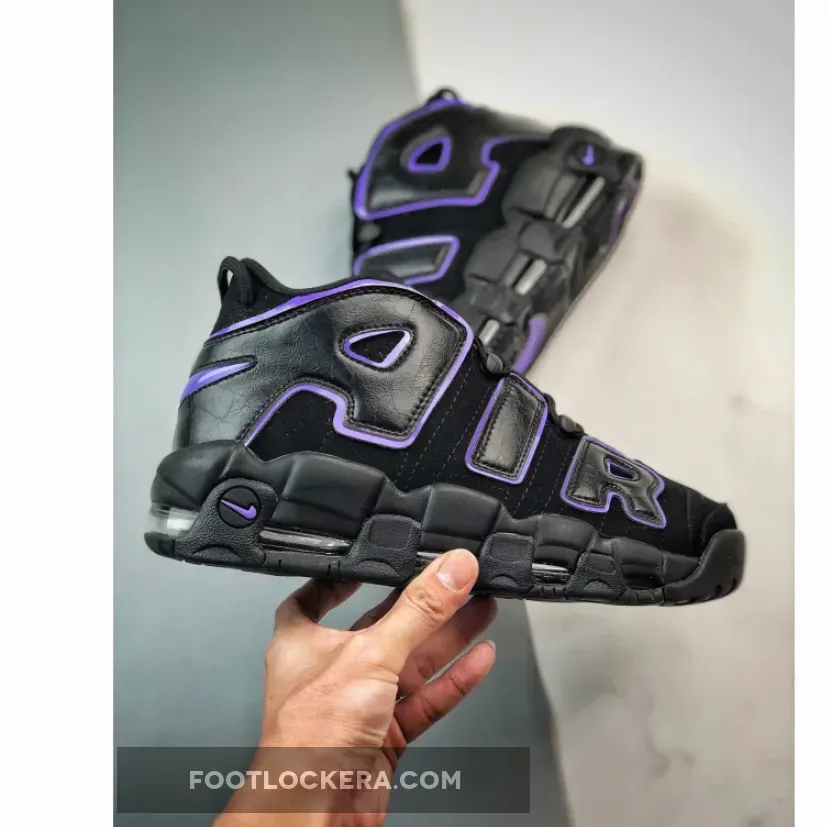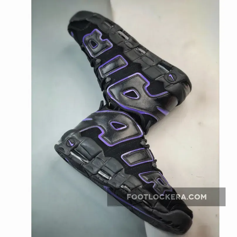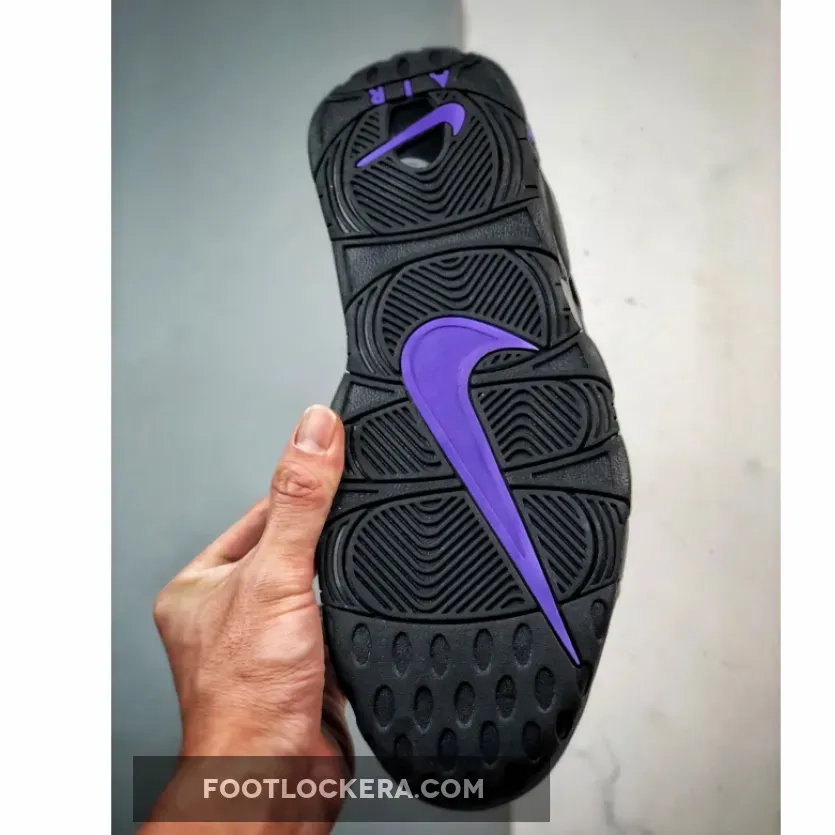 Dressed in a Black, Action Grape, White, and Metallic Gold color scheme. This offering of the Nike Air More Uptempo features a Black nubuck base with mesh tongues and cracked leather overlays. The underlays of the sewn-on “AIR” patches are in high-contrast Action Grape. Mini encircled Swooshes in purple adorn the lateral heels. An all-black sole unit with exposed Air bags and purple accents on the tread caps off the design of this sneaker.
