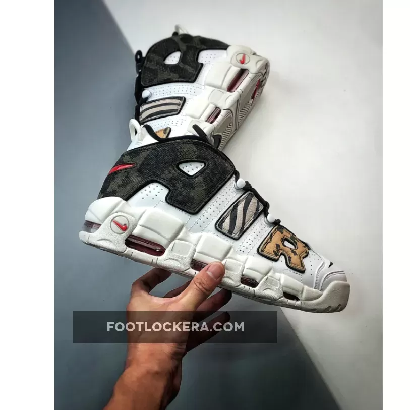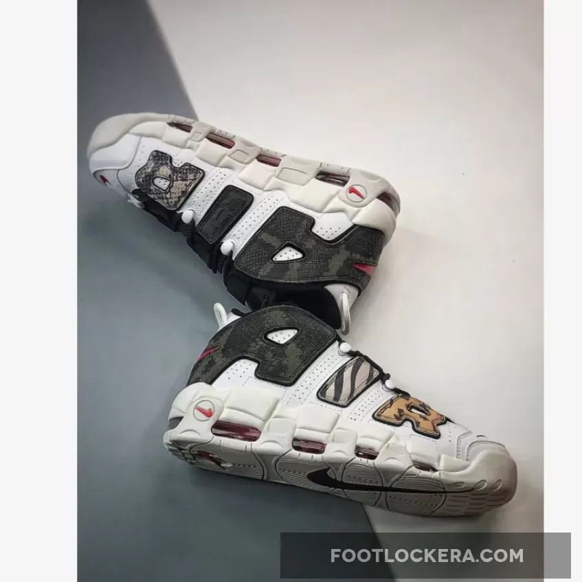 From a first look, we see that this Nike Air More Uptempo “Animal” features a clean white perforated leather base with contrasting black tongues and laces. Elevating the signature oversized “AIR” branding are various exotic prints such as snake, zebra, and cheetah. Rounding out the final details are the slash marks on the tongues, and the red contrasting accents seen throughout.