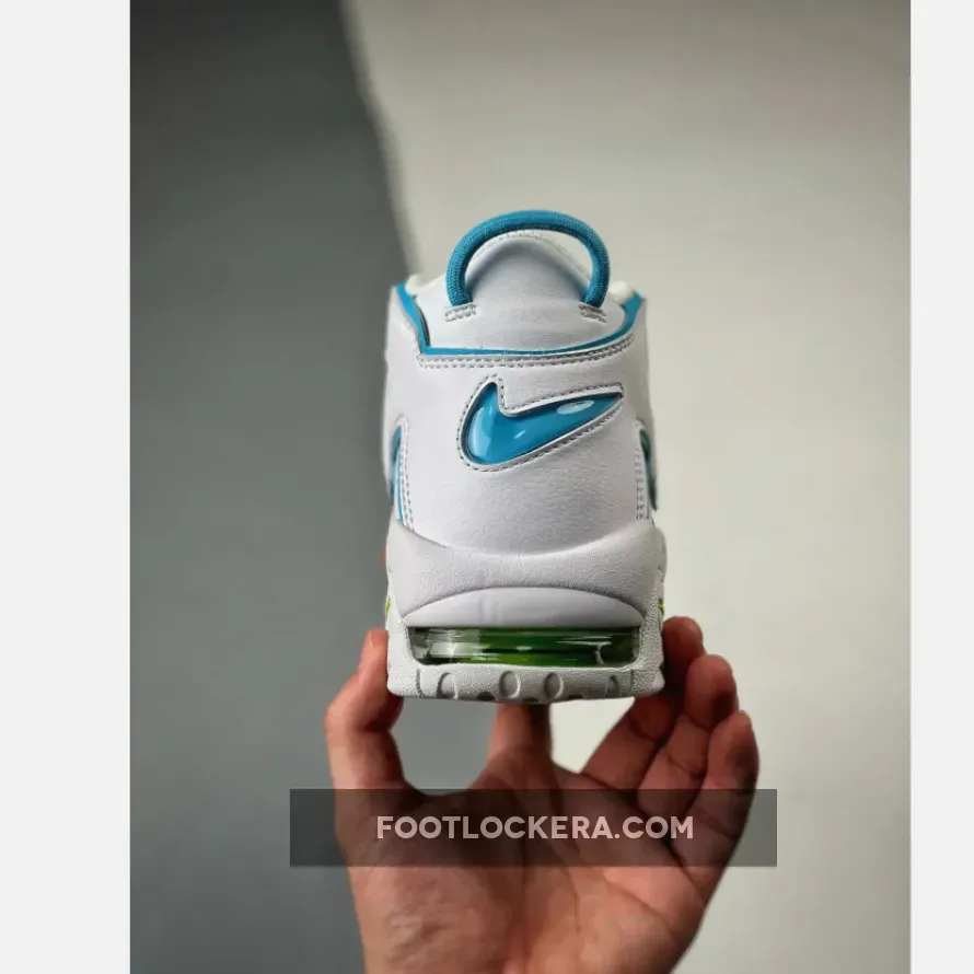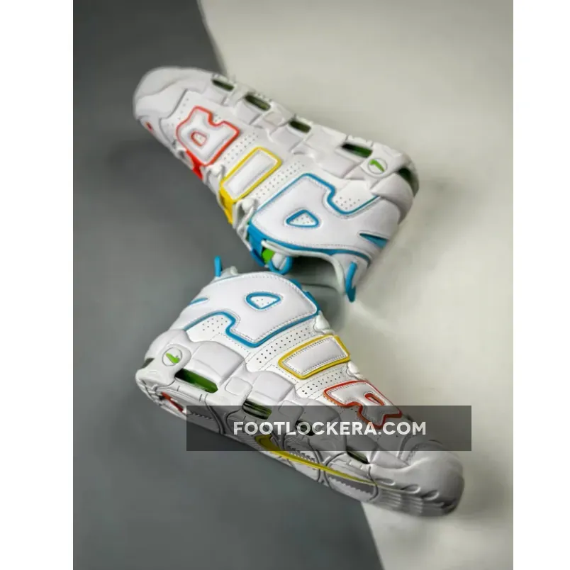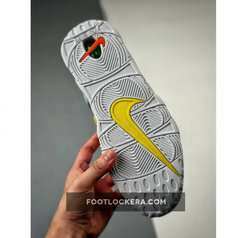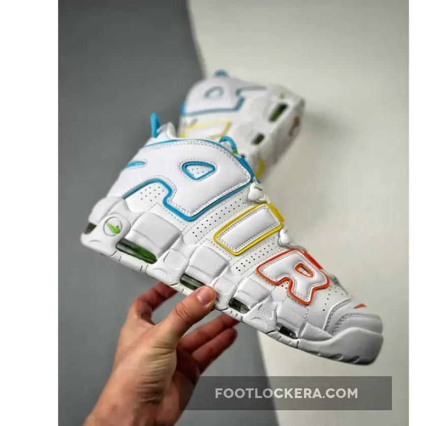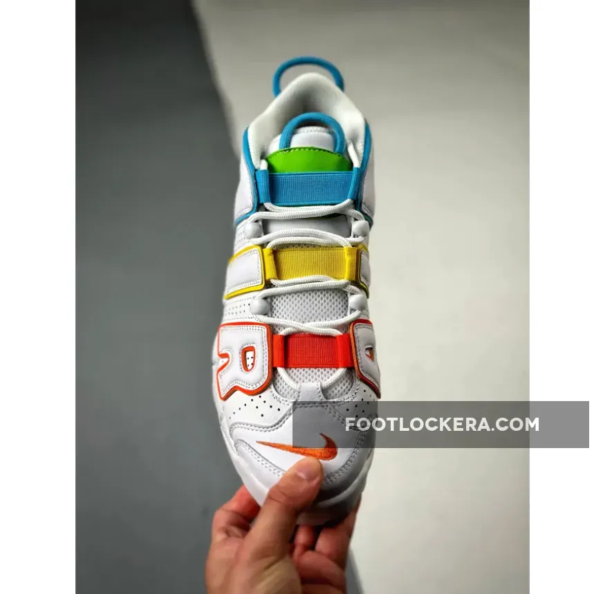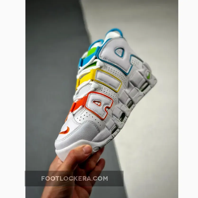 The Nike Air More Uptempo is predominantly white with popular orange, yellow, blue and green accents. Most of the upper and sole are trimmed in White. Pull tabs around the tongue and collar in blue accents. The sole contains a transparent color air cushion. Fineline detailing on the outsole. The logo on the side of the shoe is to display the three letters “AIR” in blue, yellow and orange tones. The tonal order also follows the label on the laces. There is an orange swoosh on the forefoot of the shoe. The midsole of the shoe features a small green swoosh logo.