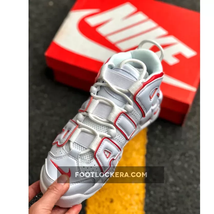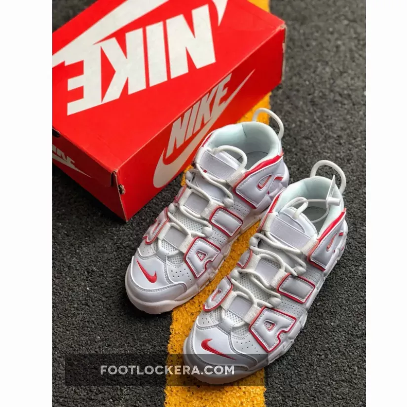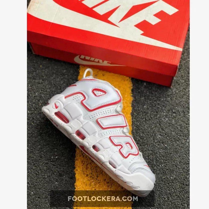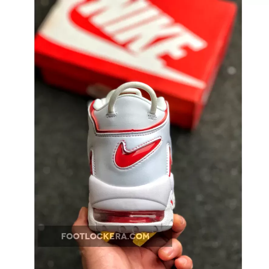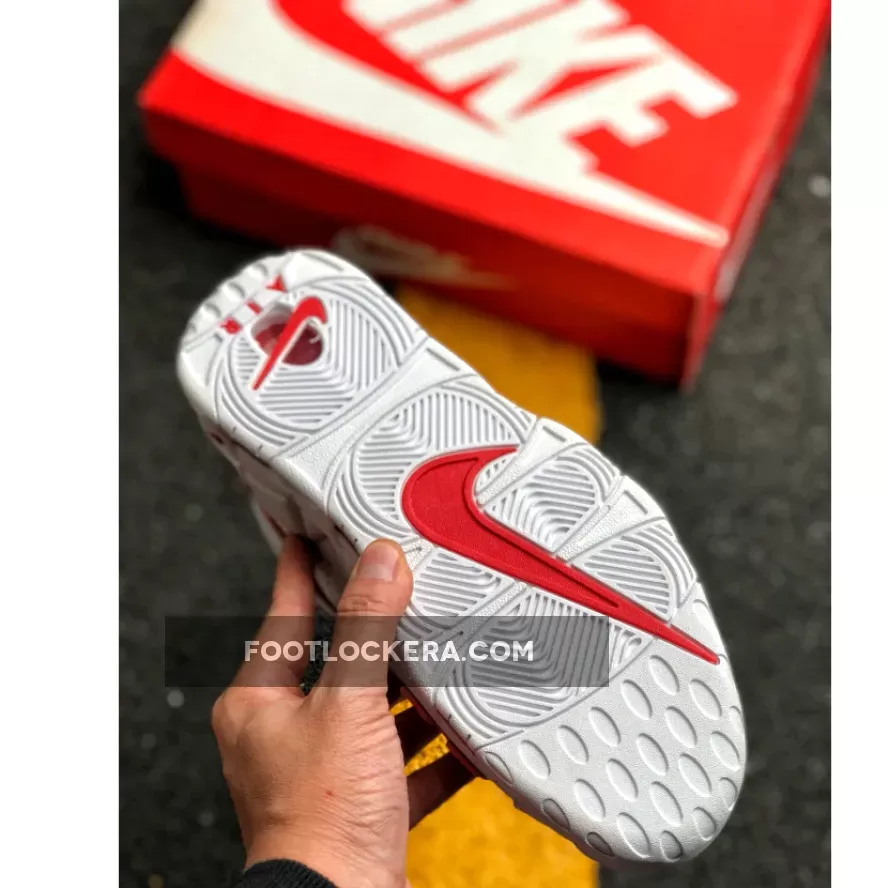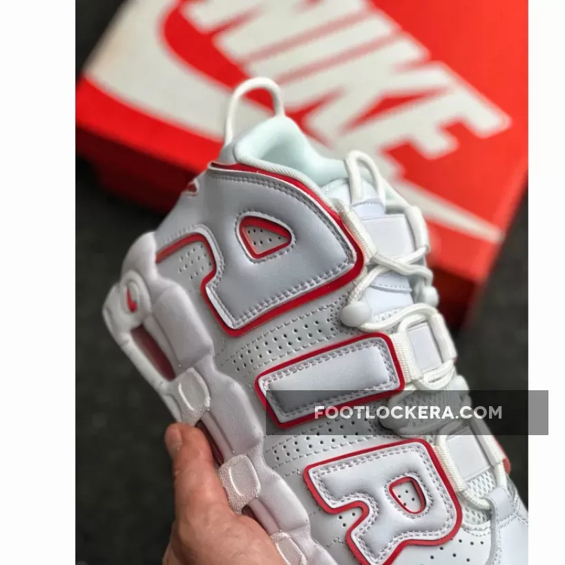 this Nike Air More Uptempo resembles the original release, while utilizing White leather throughout and perforations on the sides. Next, Varsity Red outlines the large ‘AIR’ branding on the sides. More Red adorns the Swoosh logos on the midsole, toe, and heel.