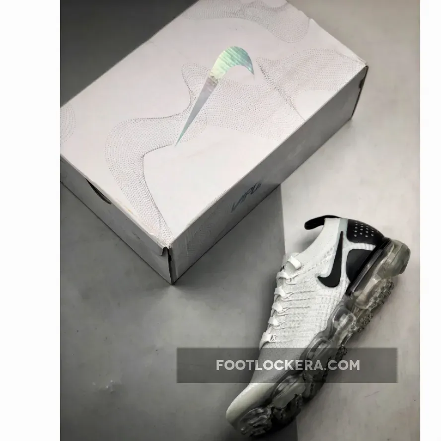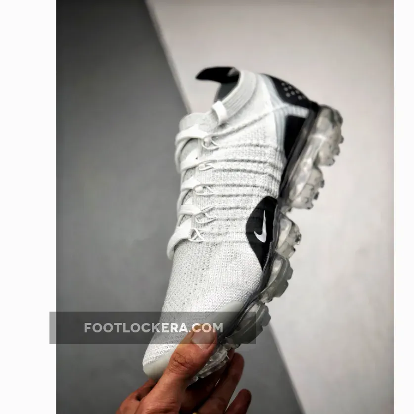 The shoe features a White Flyknit upper paired with Black detailing on the Swoosh logo, heel clip, tongues and heel tabs. A clear full-length VaporMax sole unit completes the design.
