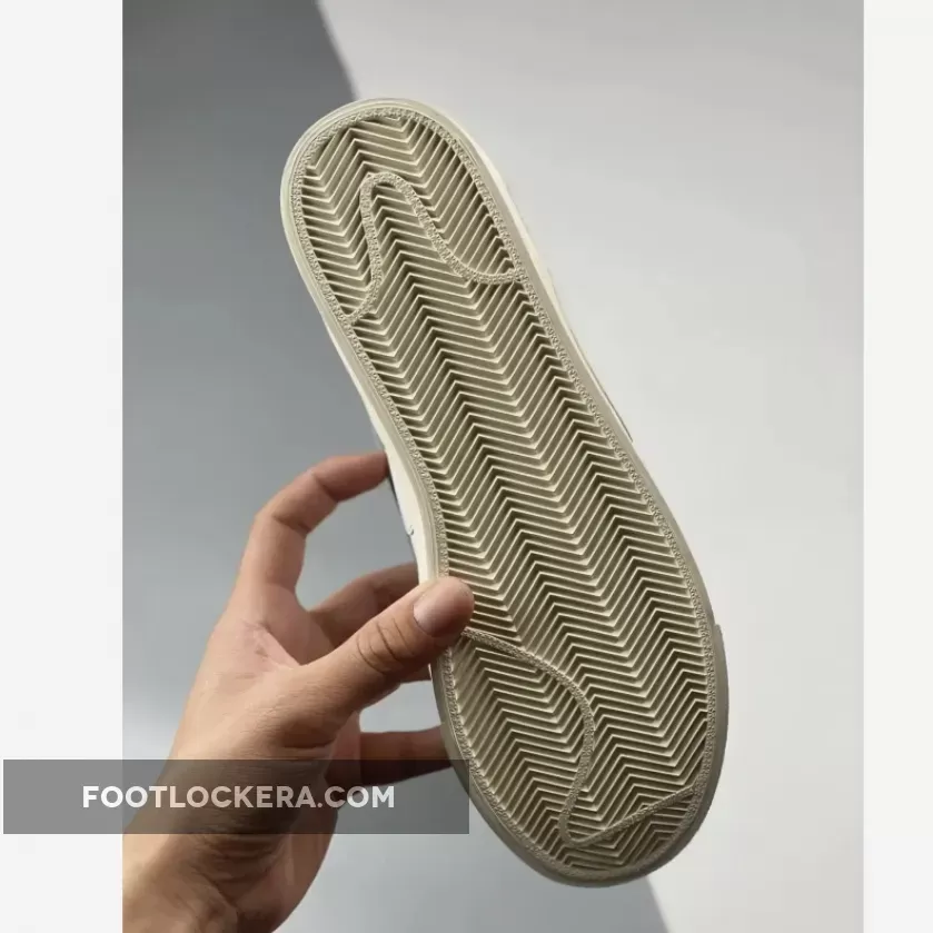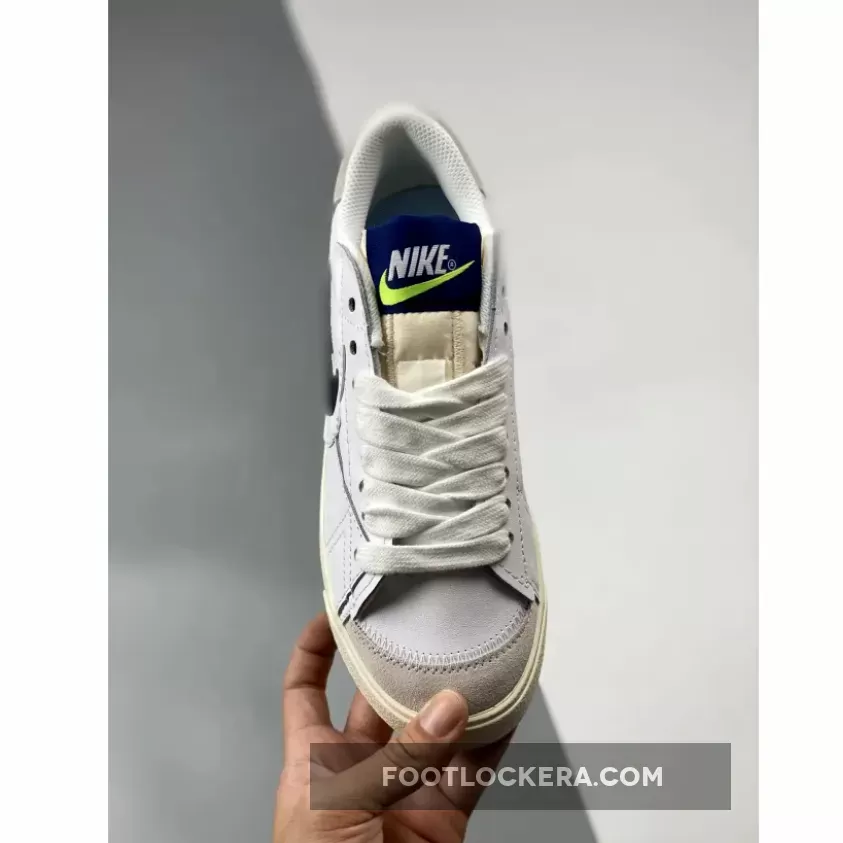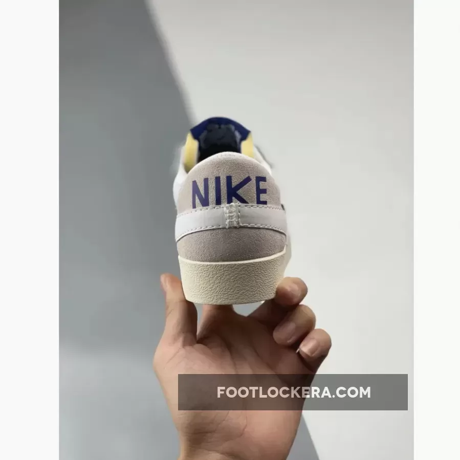 The Nike Blazer Low Jumbo White Navy offers a more understated but still eye-catching look. It has the classic low-top Blazer silhouette with a smooth colourless base and matching oversized white overlays. For this iteration, the off-white laces come in a regular size instead of the usual jumbo thickness. Meanwhile, the large Nike Swoosh is complemented by a blue mini Nike Check on top. Exposed tongue foam, grey suede accents at the toe and rear, and the “NIKE” branding at the heel round off the upper.