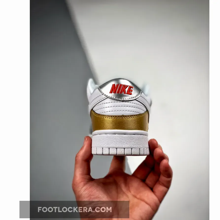 The Nike Dunk Low piles on the bling with its Nike Dunk Low Gold Silver Red.This shoe has a clean, white leather base showing on the quarter and the heel. Metallic gold stands out on the toe box and the heel counter while metallic silver covers the toe cap, the collar and the heel tab. The signature profile Swooshes on both the medial and the lateral sides are in plain white, matching the laces. The flashiest part of this shoe is the metallic gold Nike-branded deubré with a matching gold chain. Retro Nike branding in black and University Red sits on the white tongue tab while the Nike text logo is embroidered in red on the silver heel tab.