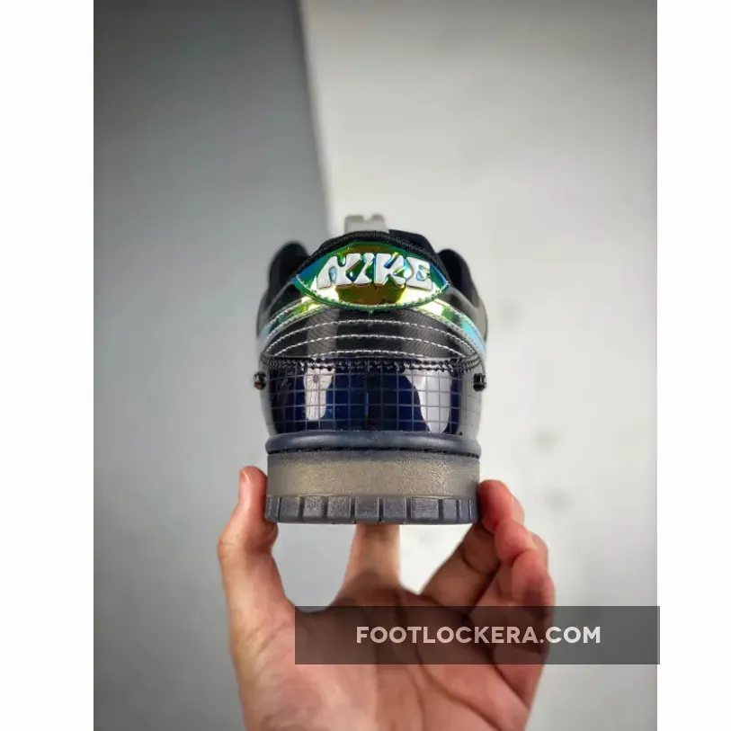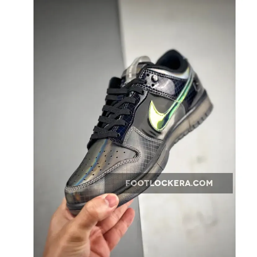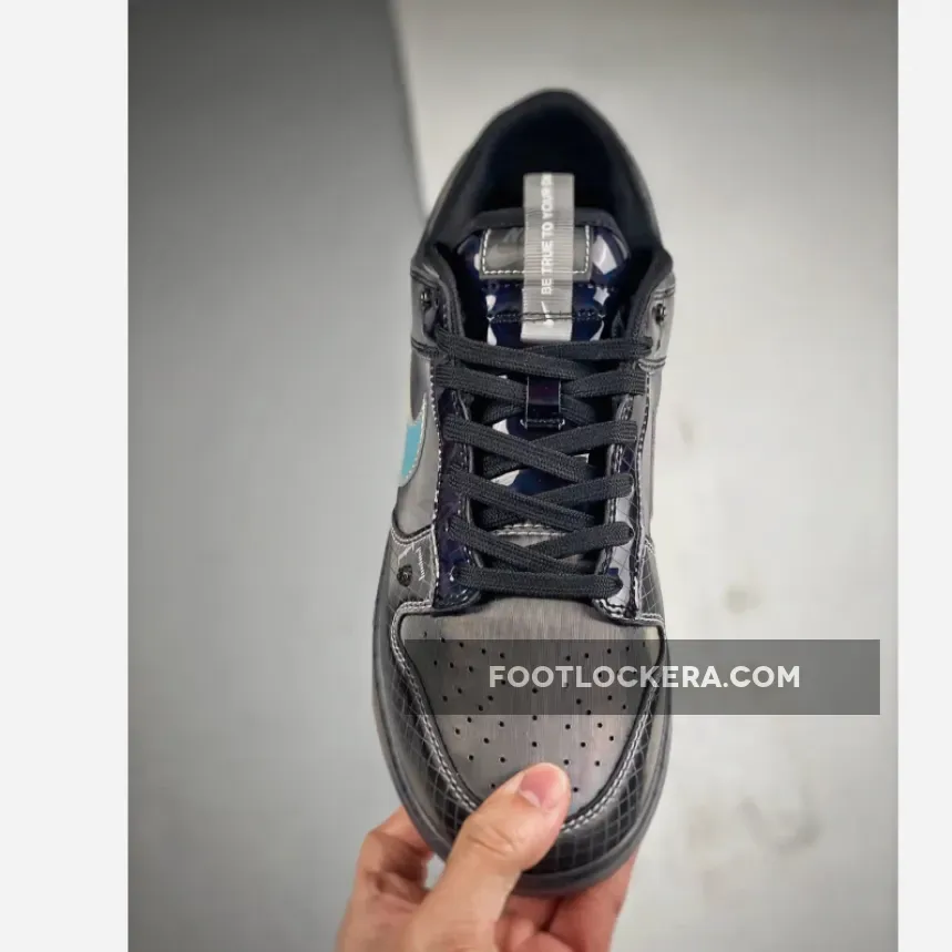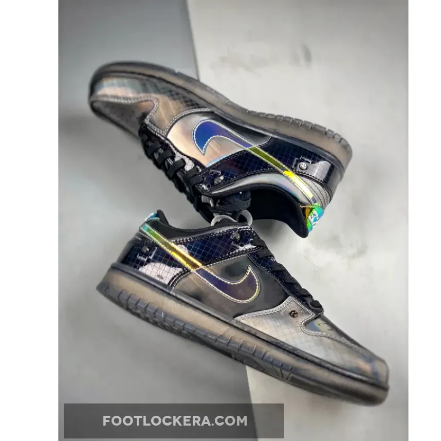 Nike is launching a second iteration of the Dunk Low “Hyperflat”, featuring darker, grey-scaled approach. The gridded pattern at the toe-guard captures that gun-metal hue, contrasted by the pitch black lace collar and heel — but off-set by a slightly oily finish. The Swoosh and heel tab, in particular, boast a reflective gloss that adds a touch of allure. The font choice blends nostalgia with a hint of retro-robotic aesthetics. Completing the overall look are the tongue pull-tabs, Phillips-head rivets, and a smoke-grey transparent outsole.