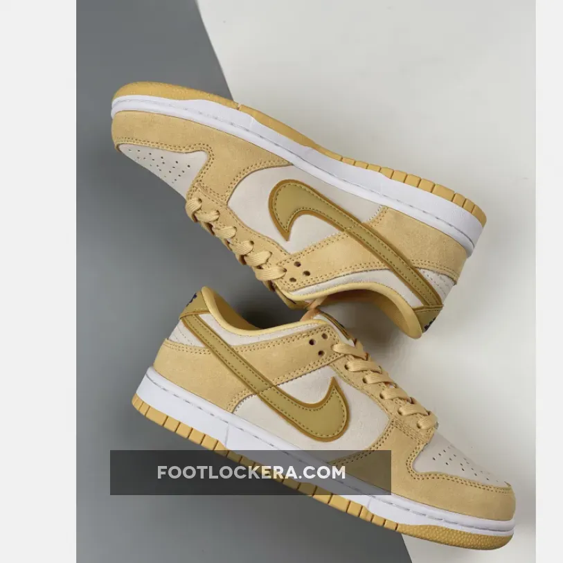 Whether worn on court or street – the Nike Dunk Low is an 80s basketball icon whose vintage style and classic details are more on trend than ever. Despite the Dunk Low’s already countless iterations, Nike’s design team has yet again thrown a new colourway in our court. The eagerly-awaited Nike Dunk Low comes in soft suede and a bright shade of gold. Let’s take a closer look.This Nike Dunk Low may be named Gold Suede, but there is more to it than just gold. With the side panel, toe cap and parts of the heel in soft shade of off-white, the gold suede overlays on mudguard, eyestay and heel highlight the construction of the sneaker and allow it to shine. Yellow Gold patent makes an appearance on the iconic Swoosh and the rectangular logo patches on the tongue. A fresh white midsole is stitched to the upper, and grounded by an outsole that perfectly matches the Gold Suede details. The Nike logo is stitched in black on the gold collar patch for maximum effect. Double and triple stitching on the heel emphasise the quasi-artisanal quality of this coveted sneaker. If you want to go a tad bolder than the classy Nike Dunk Low Gold Suede, check out the Nike Dunk Low Tartan or the Dunk Low GS Tartan Plaid.