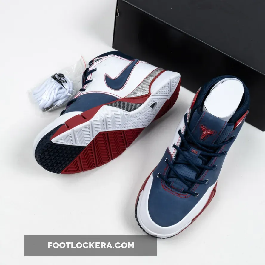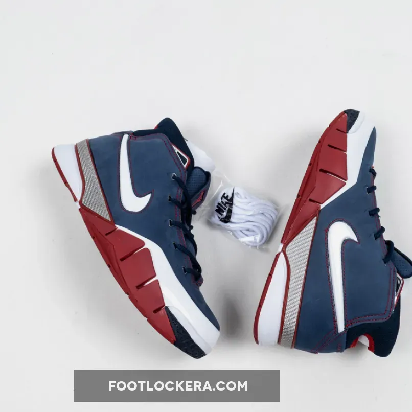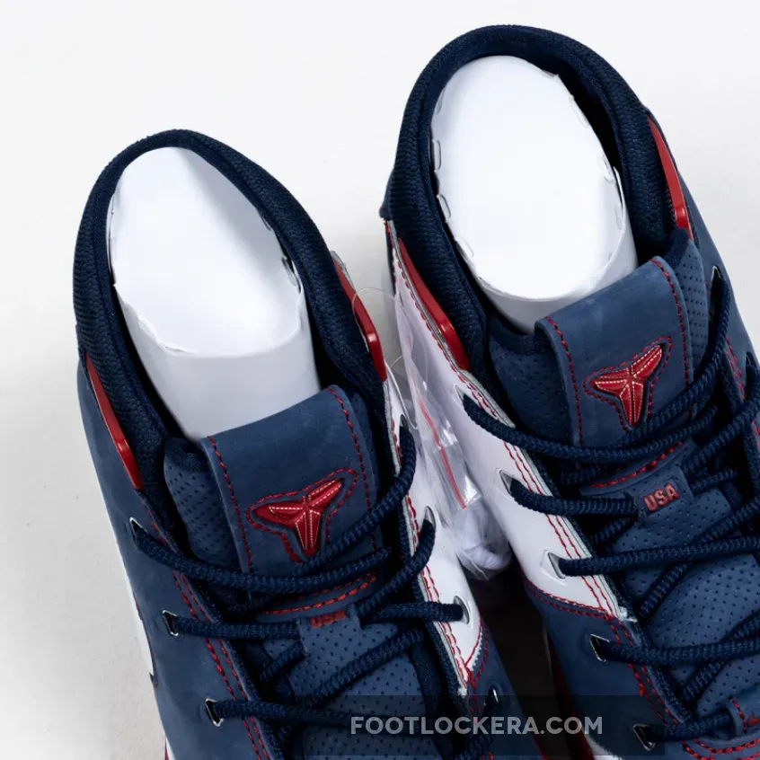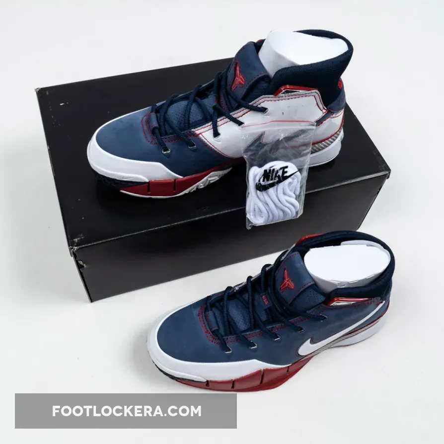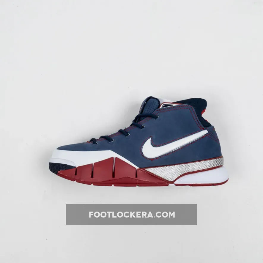 Dressed in a patriotic color scheme. This Nike Kobe 1 Protro features a Navy Blue suede and White leather upper paired with Red accents and Silver detailing. As a nod to Team USA, the shoe comes completed with branded insoles.