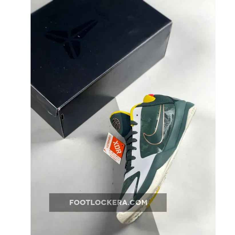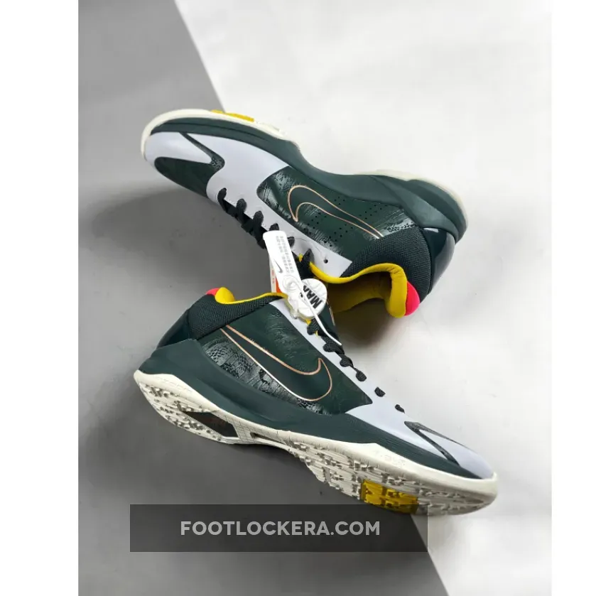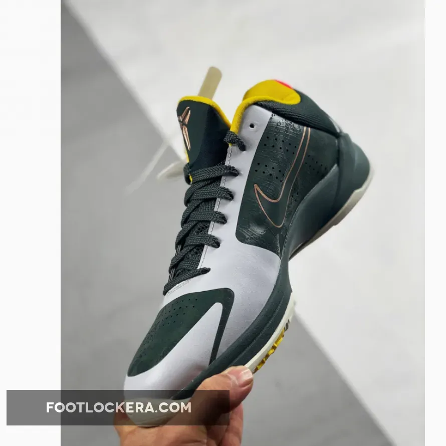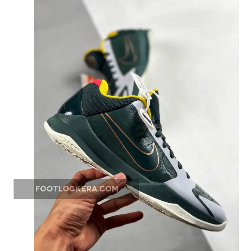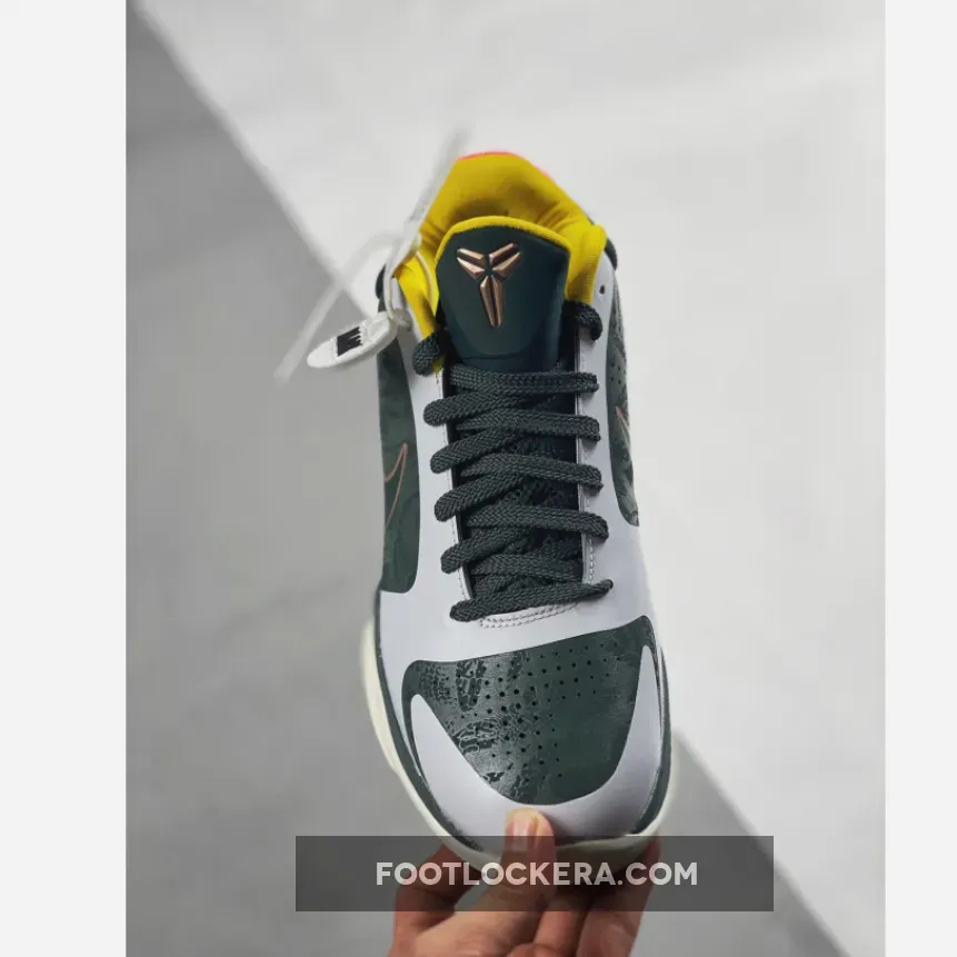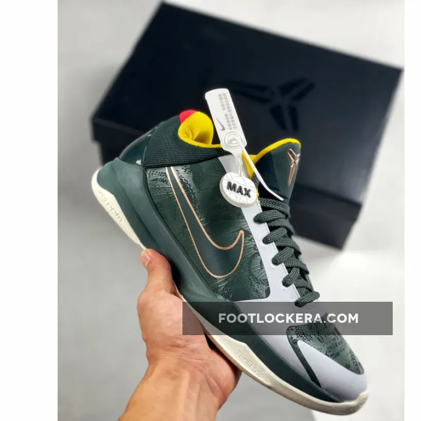The Nike Kobe 5 Protro EYBL PE is a visually stunning shoe with its forest green upper, snake-skin pattern, and bold color pops. The combination of performance features and stylish design makes it an excellent choice for both casual and competitive basketball players.