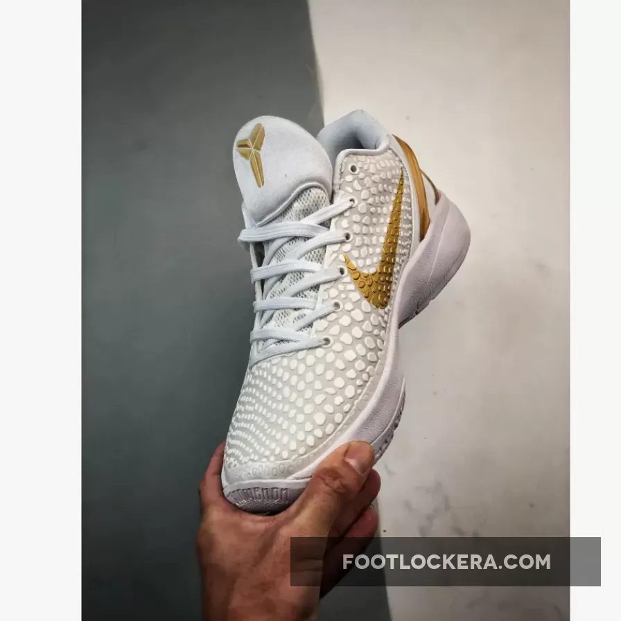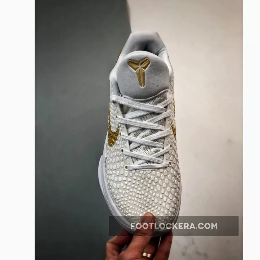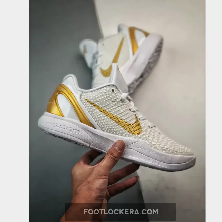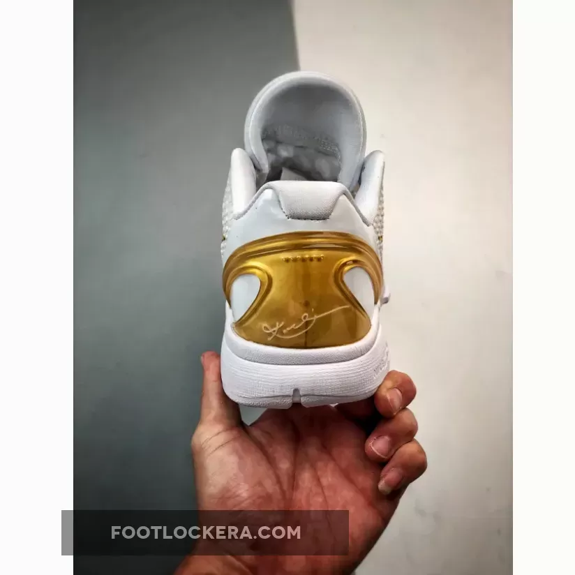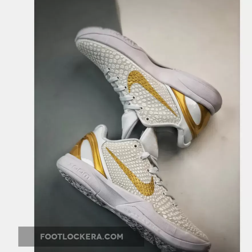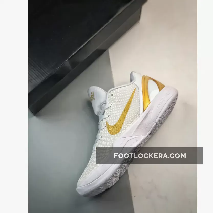 This version of the Nike Kobe 6 Protro boasts a clean White and Metallic Gold color scheme. It deviates from the original Black base, instead opting for a White backdrop adorned with striking Gold accents on the Swoosh logos and heel counter. Emblazoned on the shoe are Kobe Bryant’s inspiring “Be Legendary” motto and a prominent “BHM” emblem.