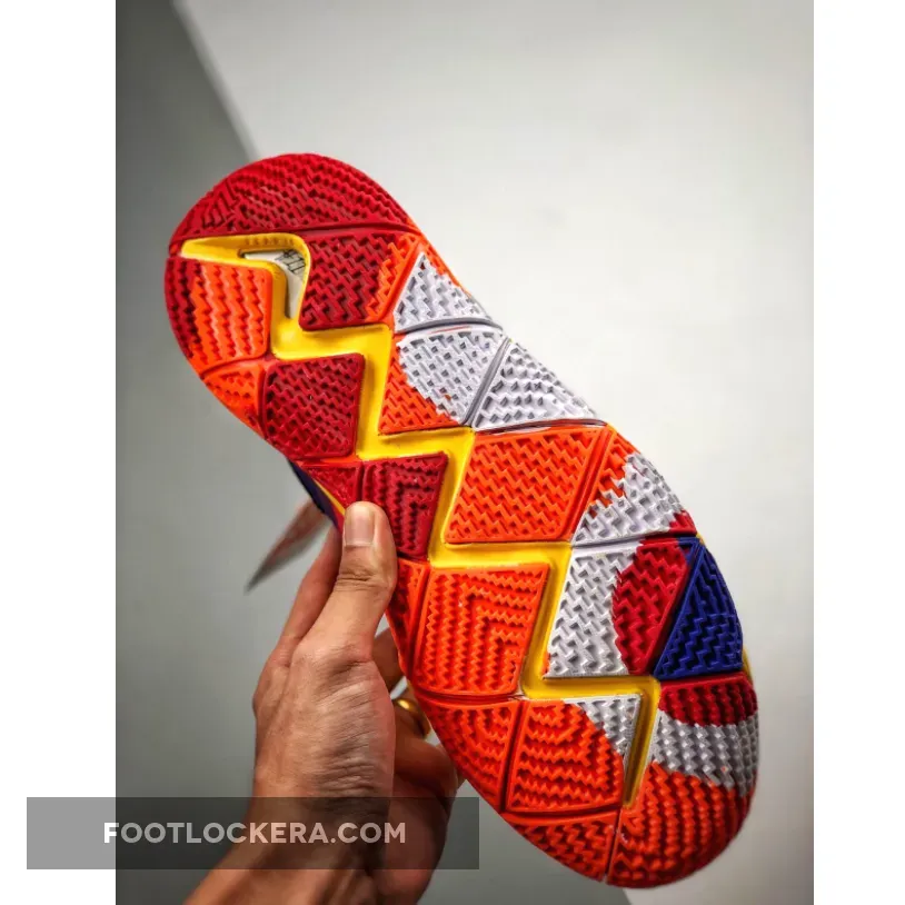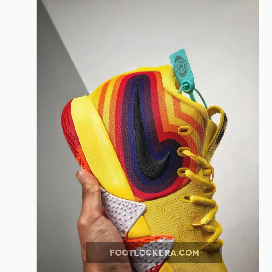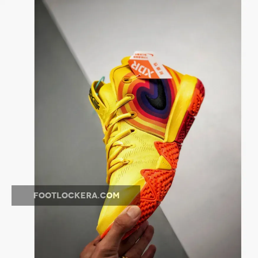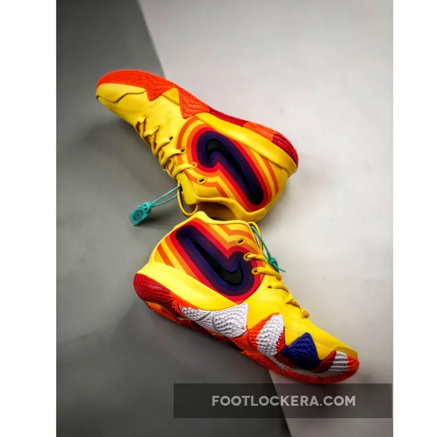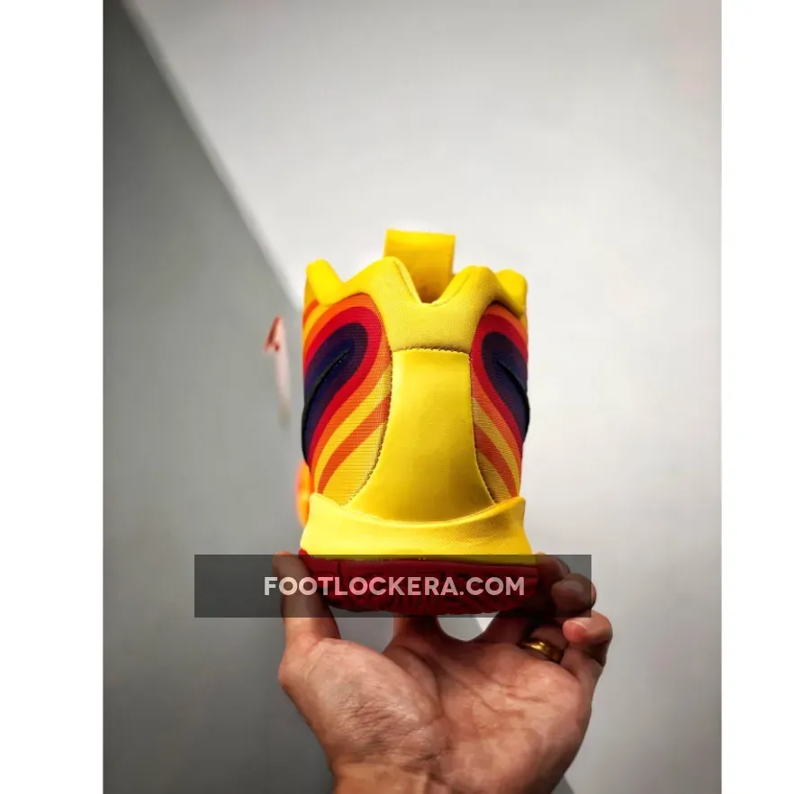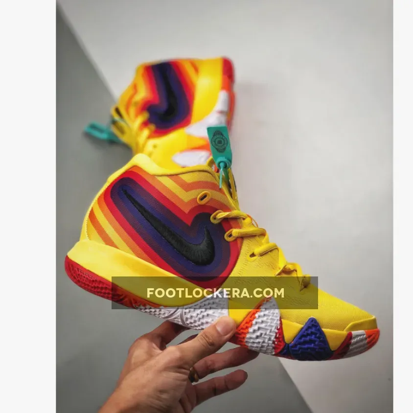 Dressed in Starburst-like colors, although the connection is unofficial, this Nike Kyrie 4 comes in a mix of Yellow, Orange, Purple, and Red color tones. It features a Yellow-based upper highlighted with a vintage pattern on the ankle area atop a colorful rubber outsole.
