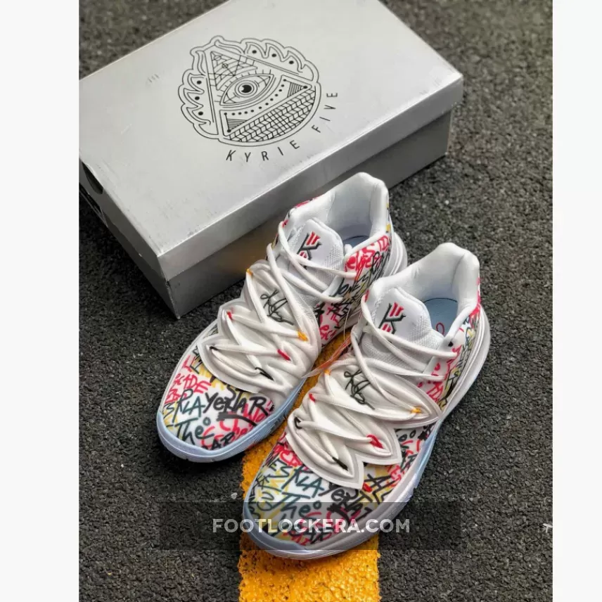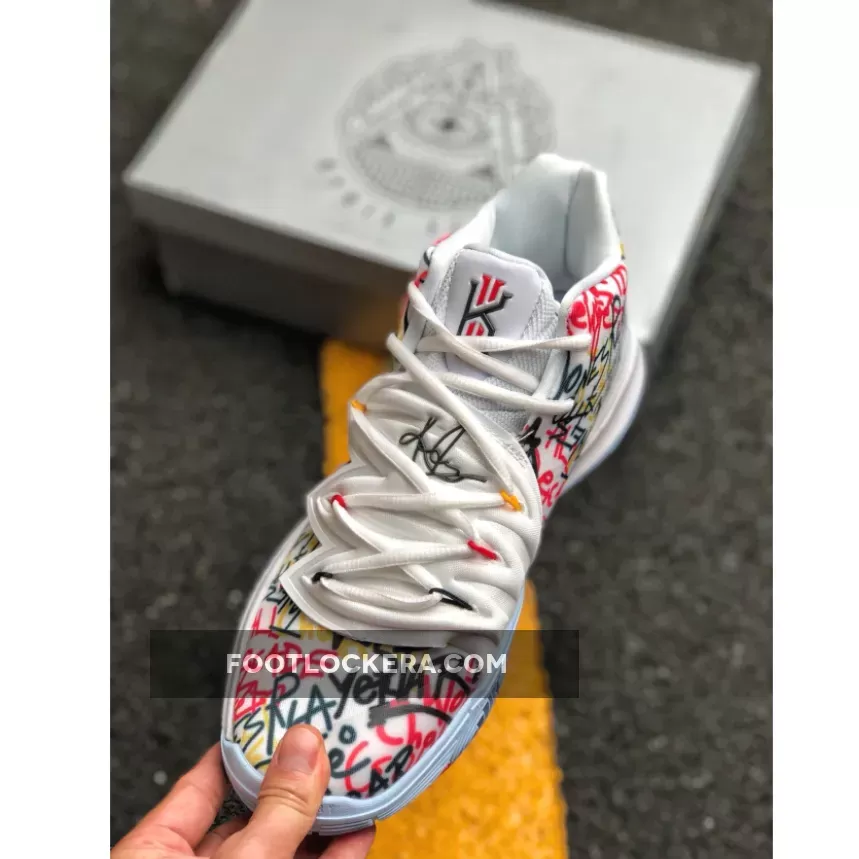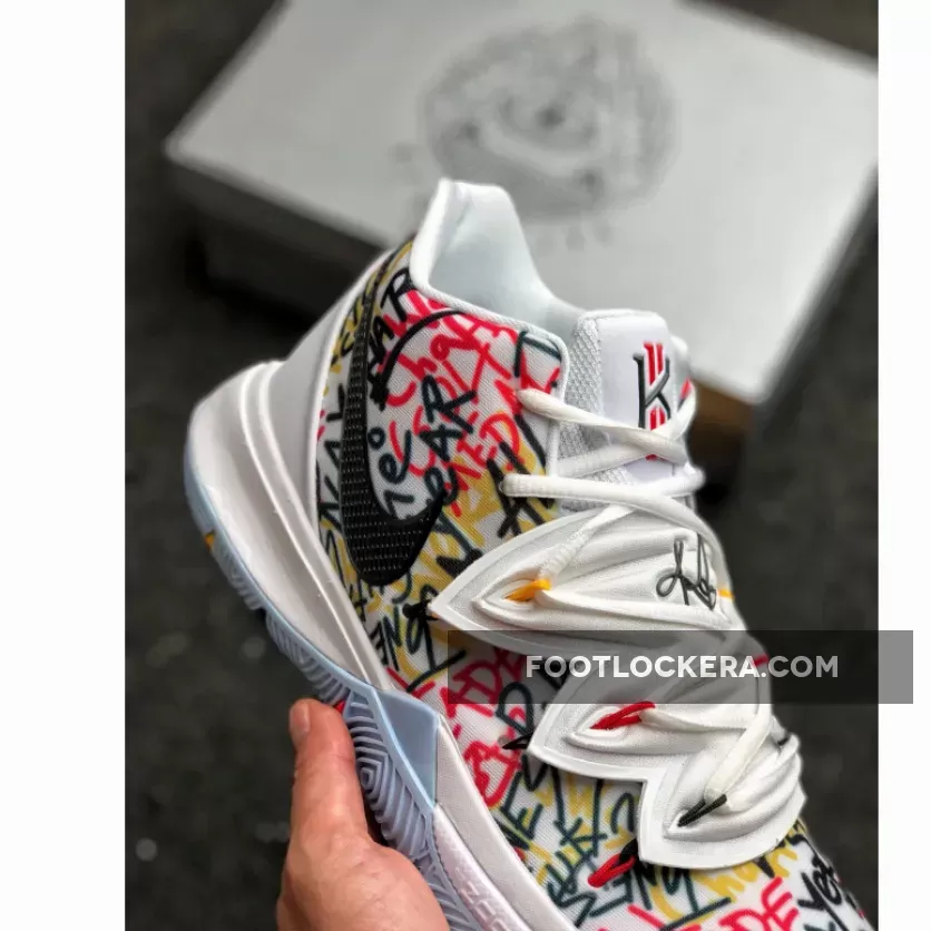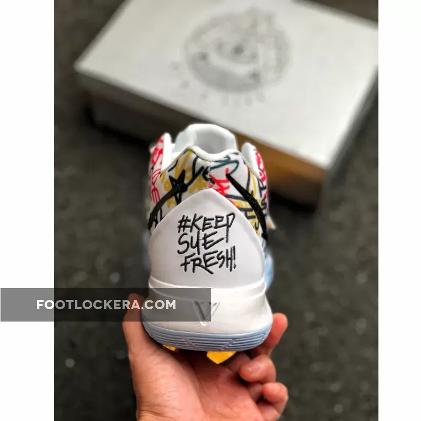This offering of the Kyrie 5 will be available in grade school and men’s sizing. It features a White-based upper covered in a colorful text throughout the shoe including a hashtag that reads, “Keep Sue Fresh.”
