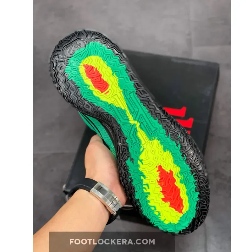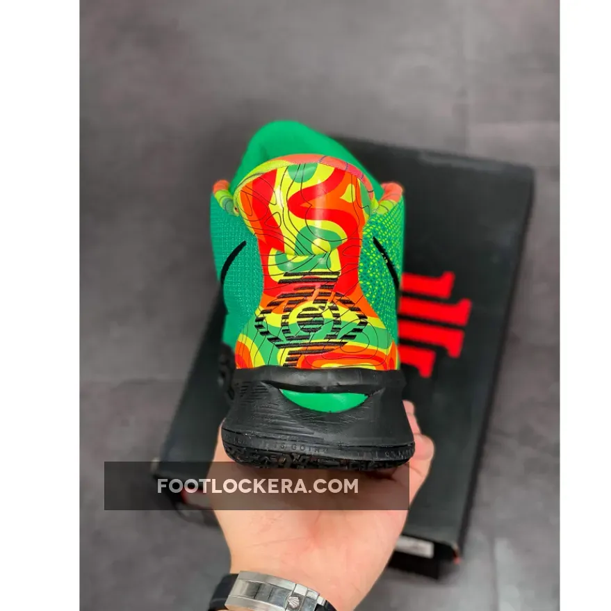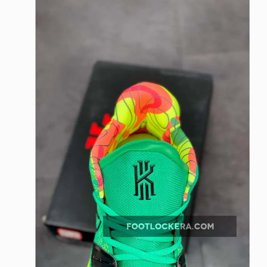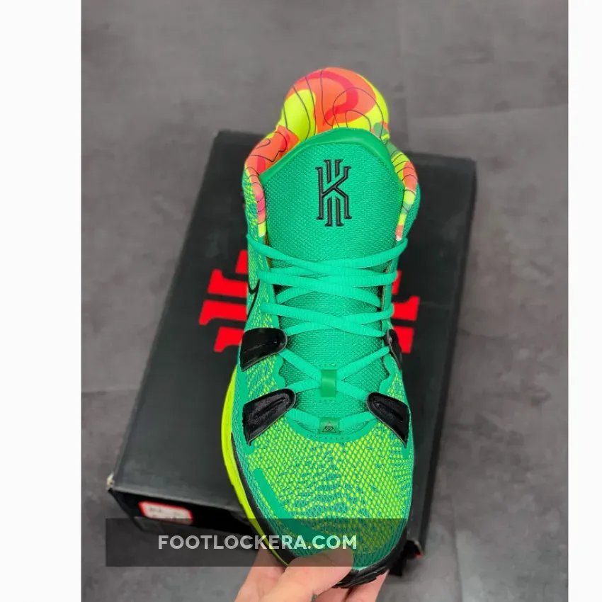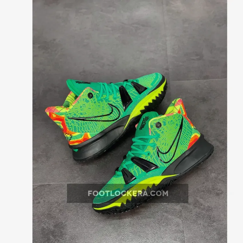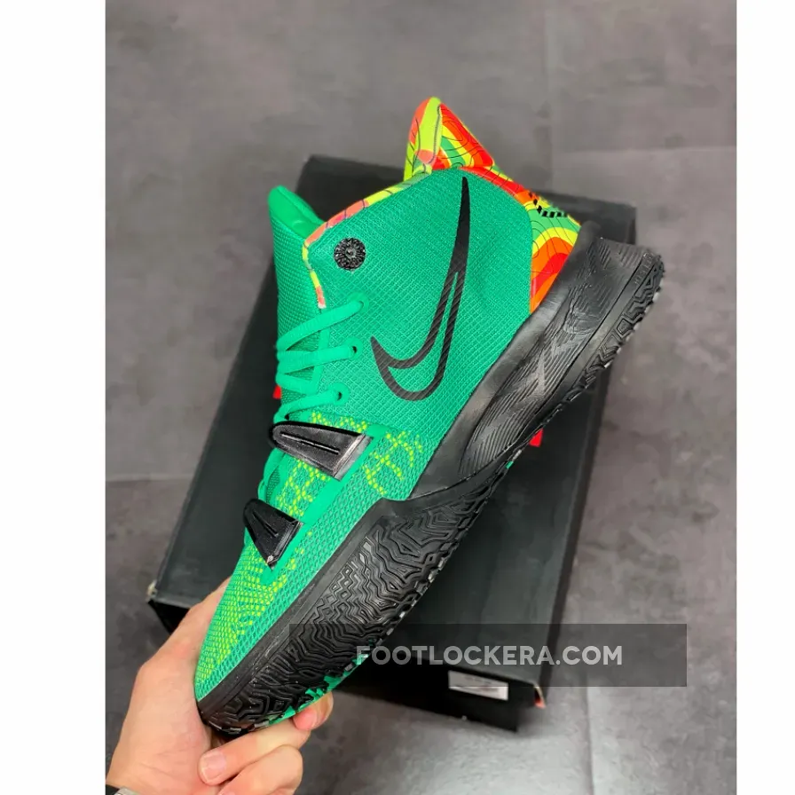 This edition of the Nike Kyrie 7 sports a similar Green base as a nod to a Green screen with the bold weather inspired heat-map pattern wrapping the heel. Other details includes Black details, branding, and rubber sole with Yellow appearing on the lateral forefoot completes the design.