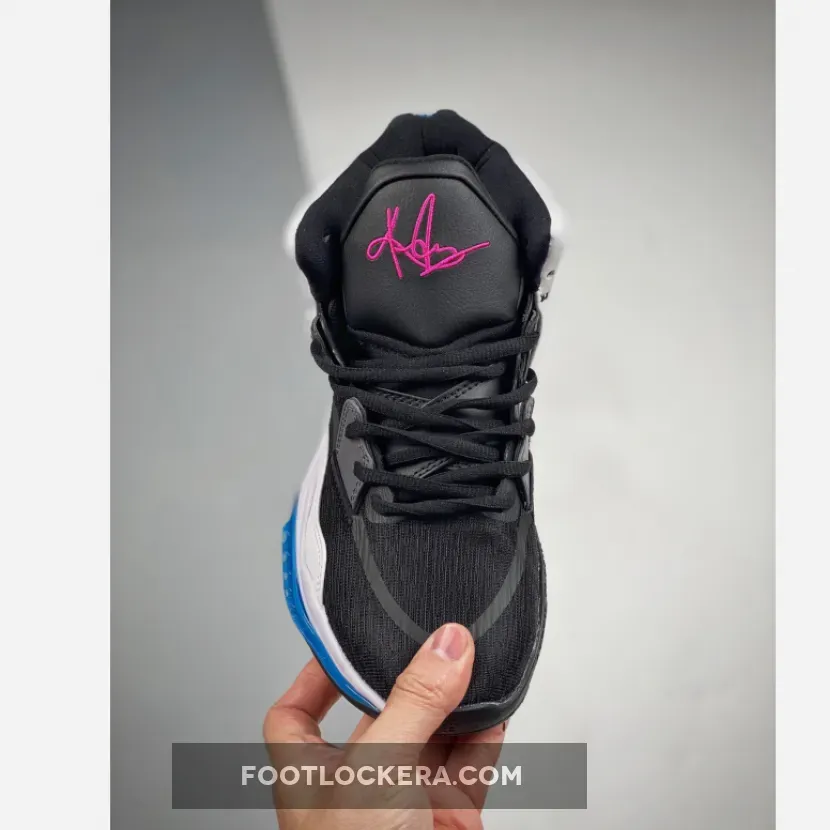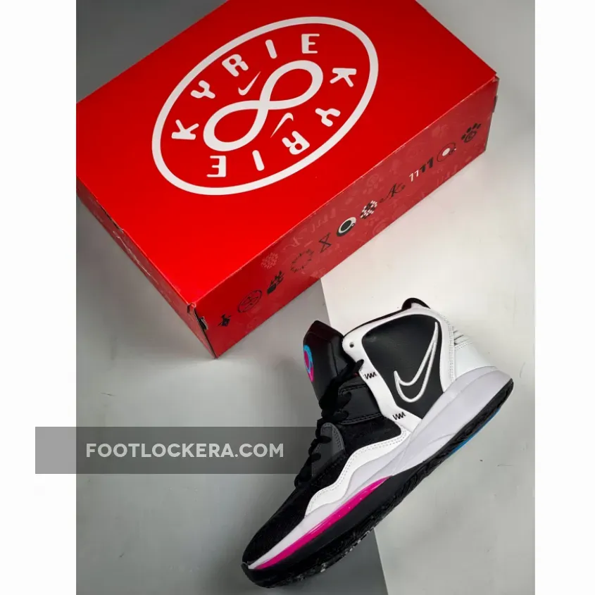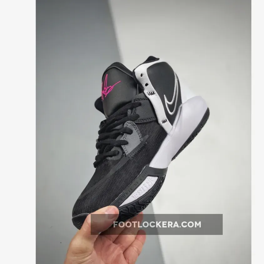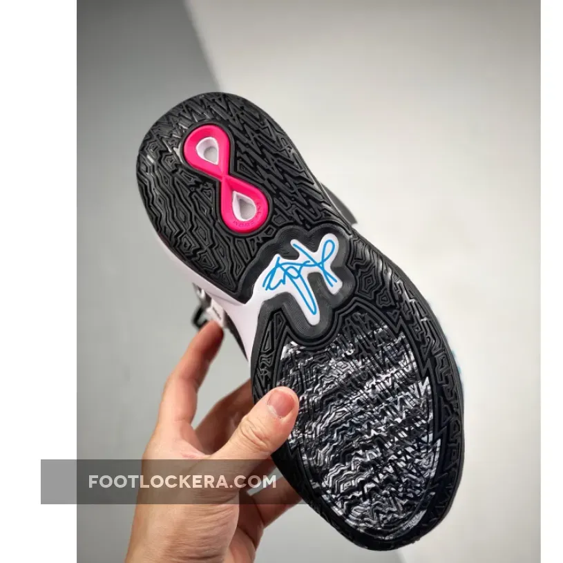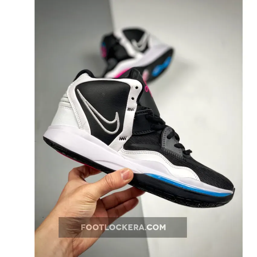 This offering of the Nike Kyrie 8 comes constructed in a mix of mesh and leather dressed in Black and White highlighted with Pink and Blue accents. Finishing off the design are Kyrie logos appearing on the tongue, heels, insoles and rubber outsole.