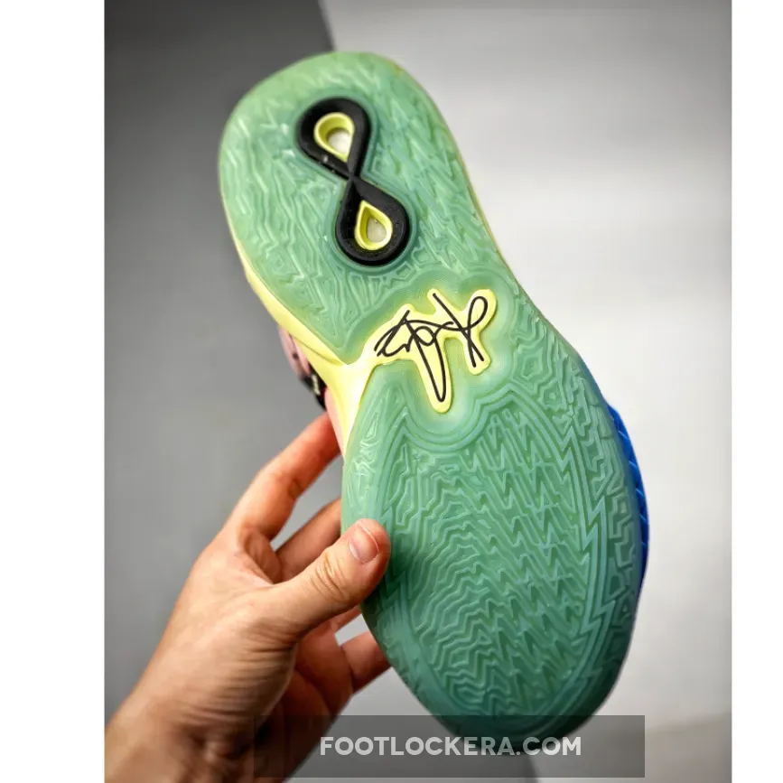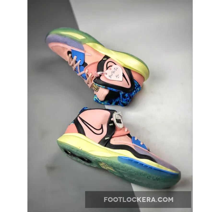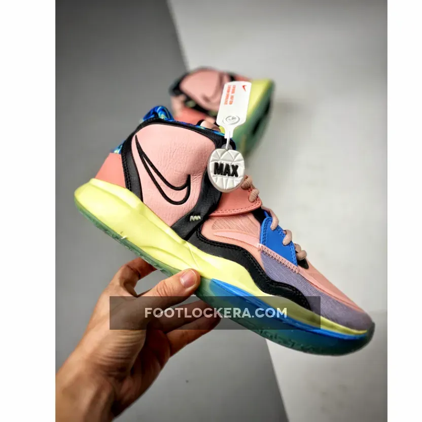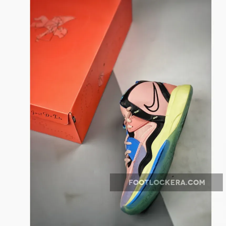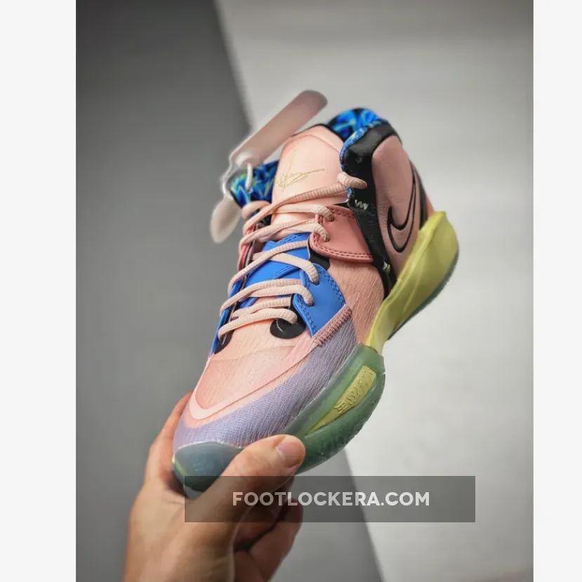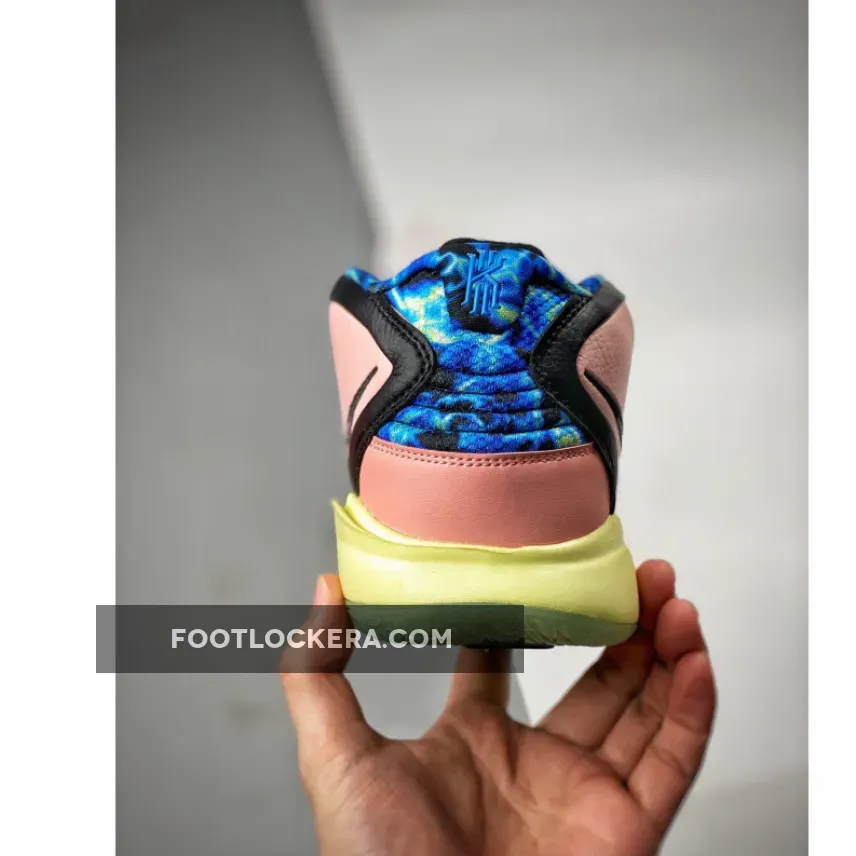The Kyrie Infinity Valentines Day version boasts a predominantly pink colorway with black, yellow, and blue accents. The sneaker incorporates Zoom Air technology on the midsole for better cushioning providing a more comfortable and bouncy feel. It has a curved outsole that improves traction and allows for quick and sharp cuts at any angle.