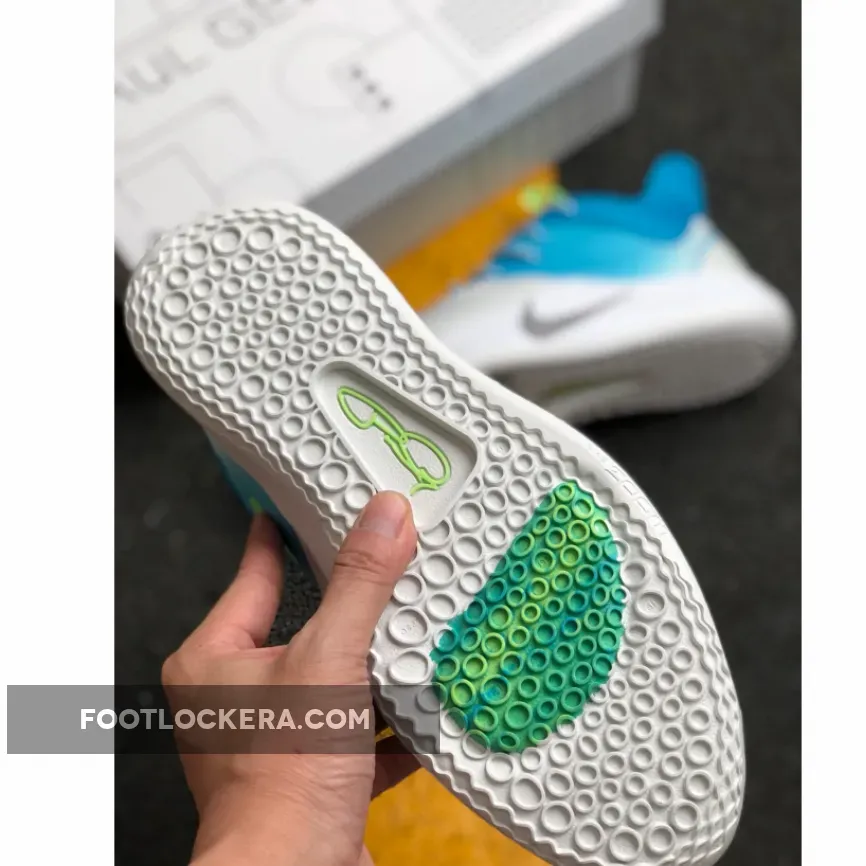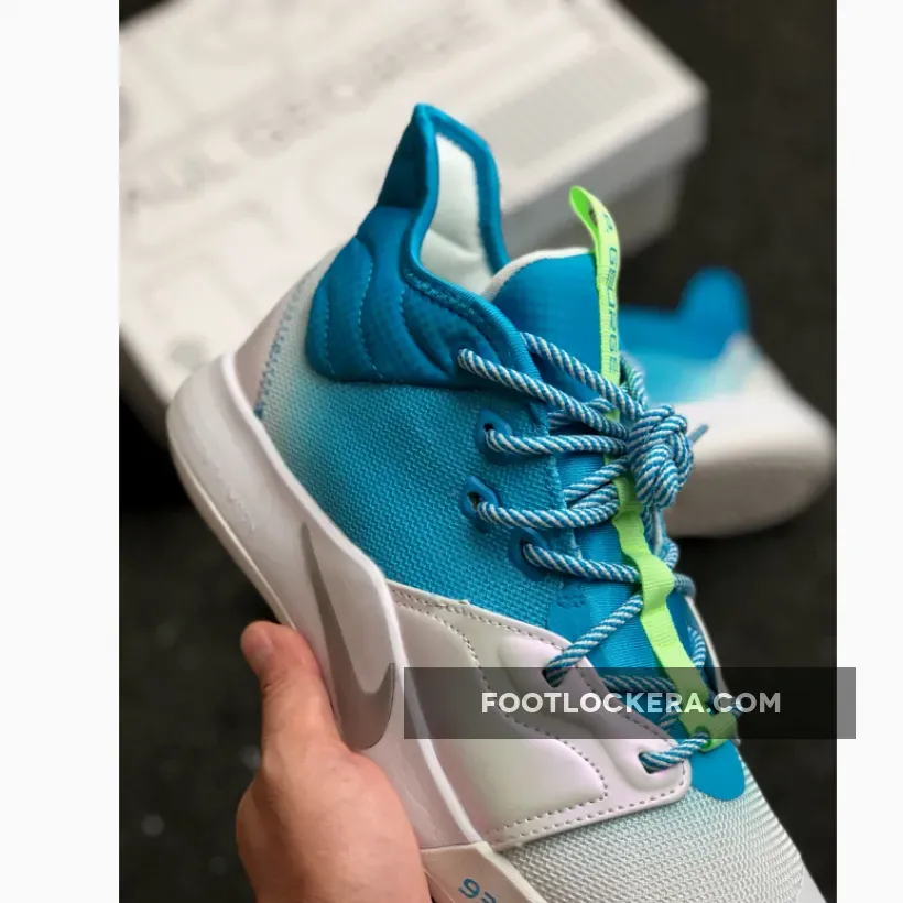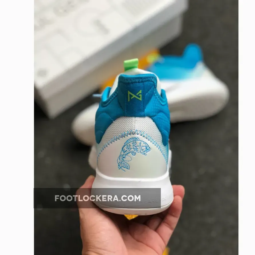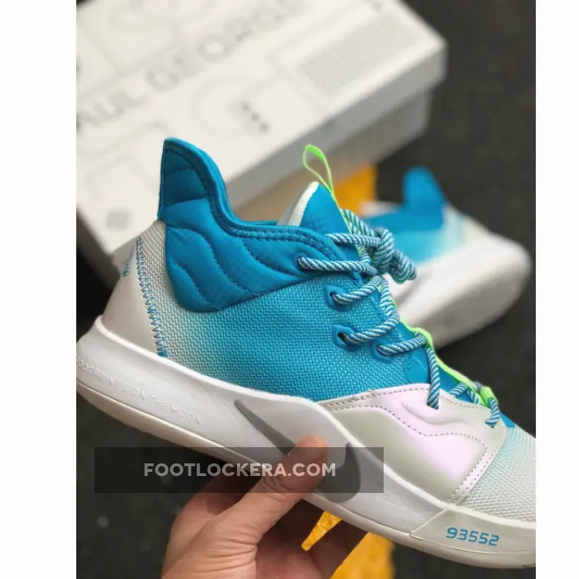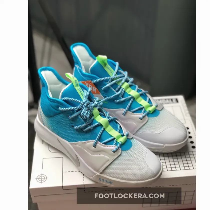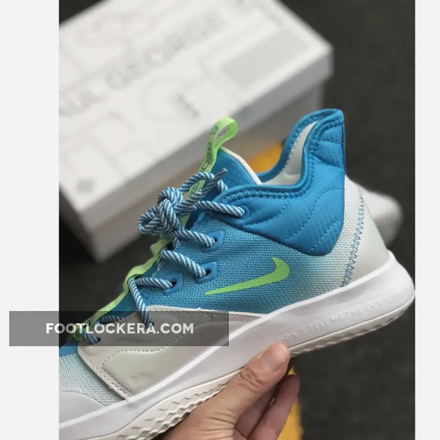 Dressed in a combination of water-themed color tones. This Nike PG 3 features a White mesh upper with Aqua Blue and Bright Green accents throughout.