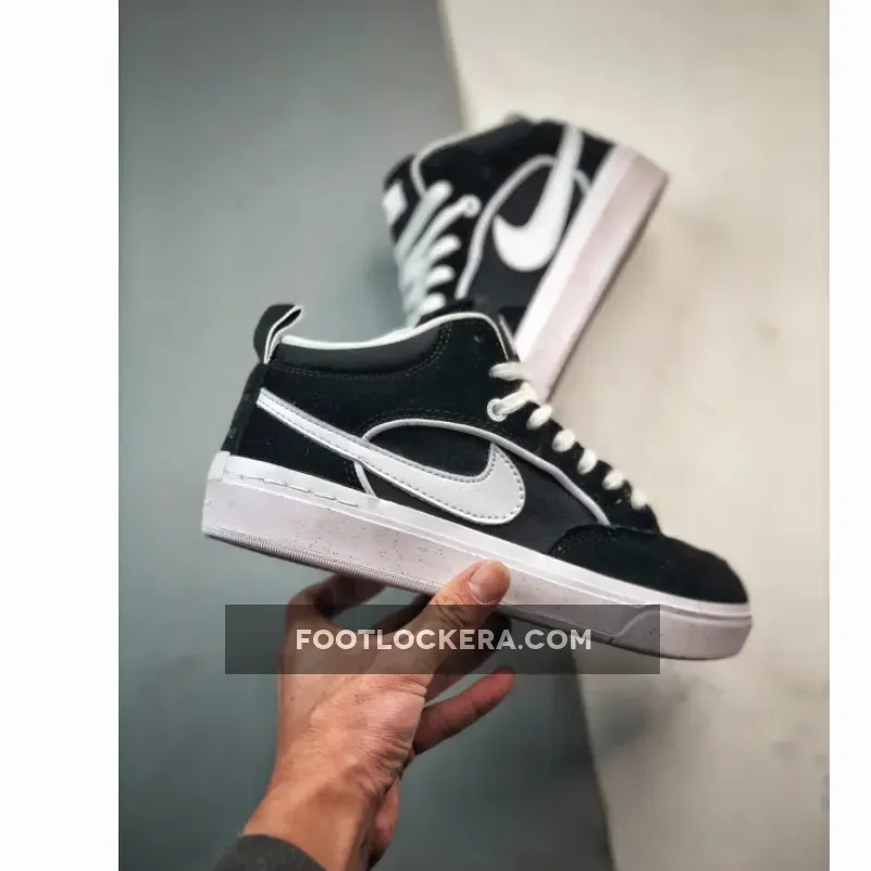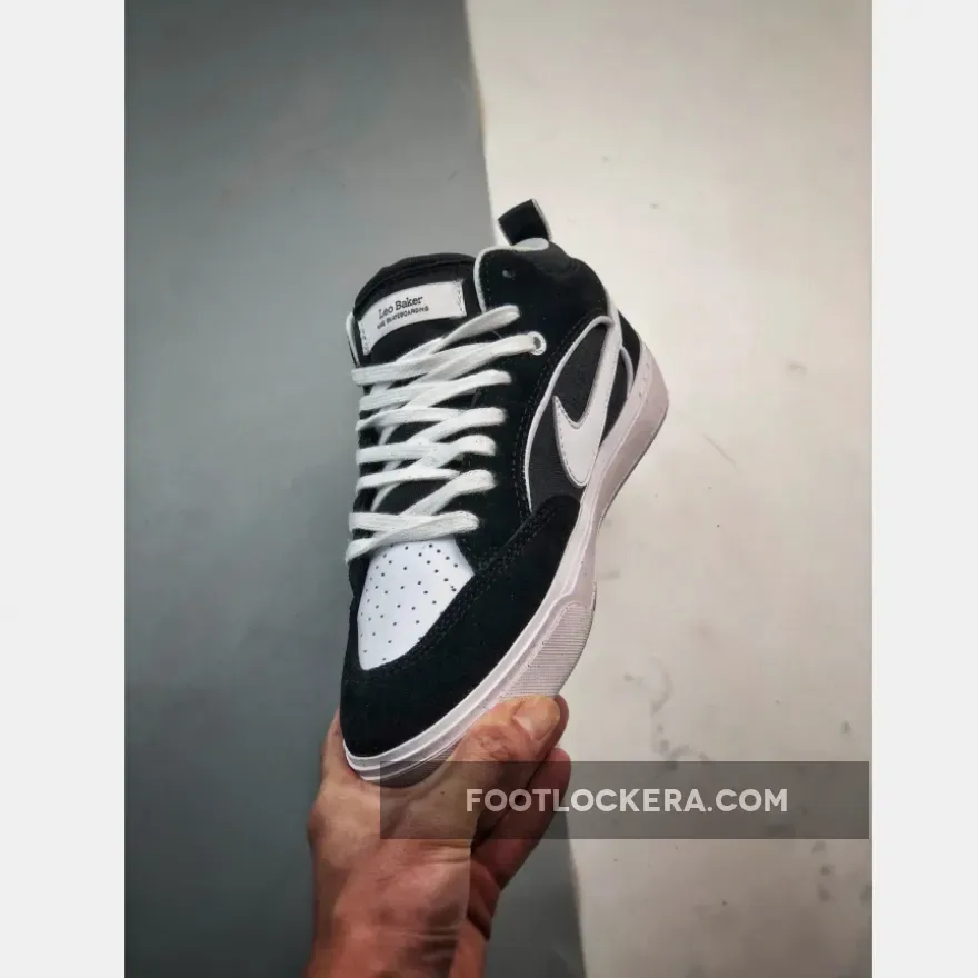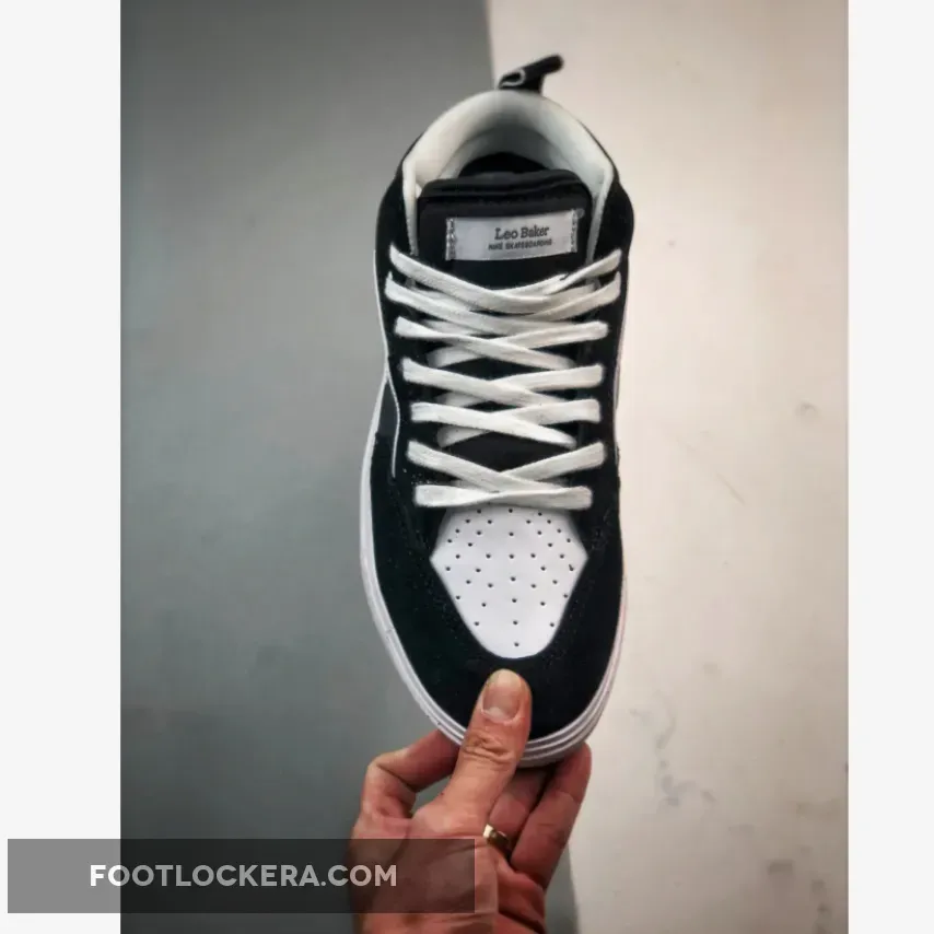 Drawing inspiration from one of their favorite skateboarding shoes, the Nike SB Bruin High, Baker ceates a mid-top sneaker made with leather, suede, and flexible mesh. This iteration has a “Black” suede upper with a perforated toebox in “White” leather. The lateral quarters have a sleek “Leo” monogram underlay that complements the “Leo Baker” branding on the tongue tag and insole. The sneaker is complete with a “White” midsole and gum rubber outsole.