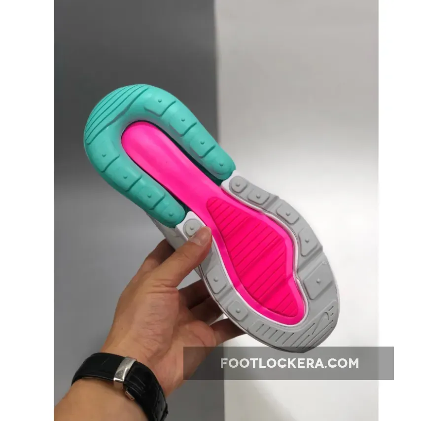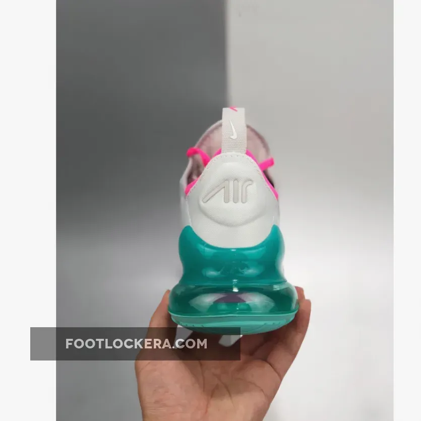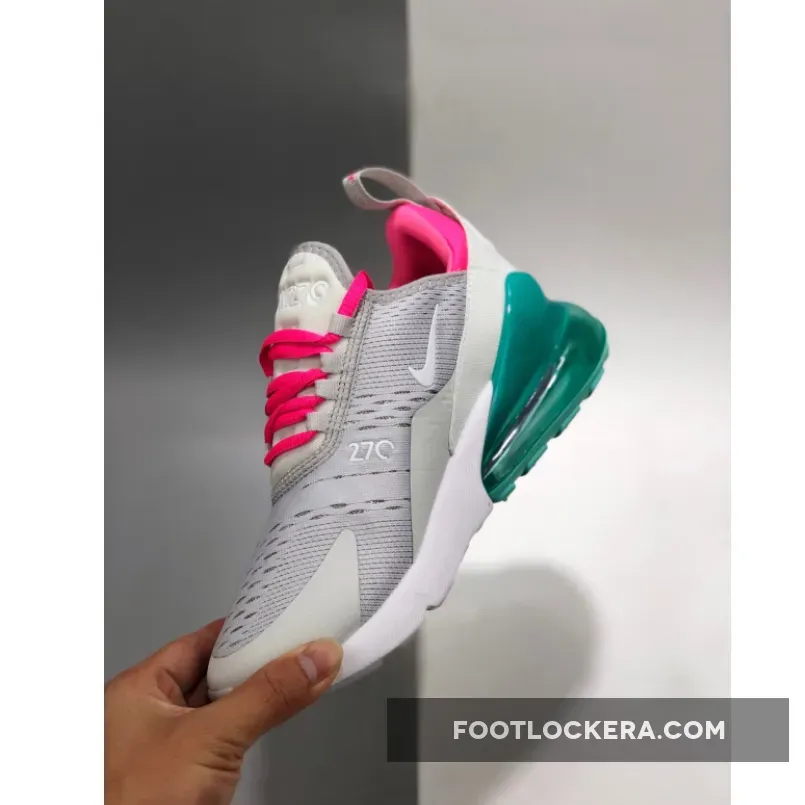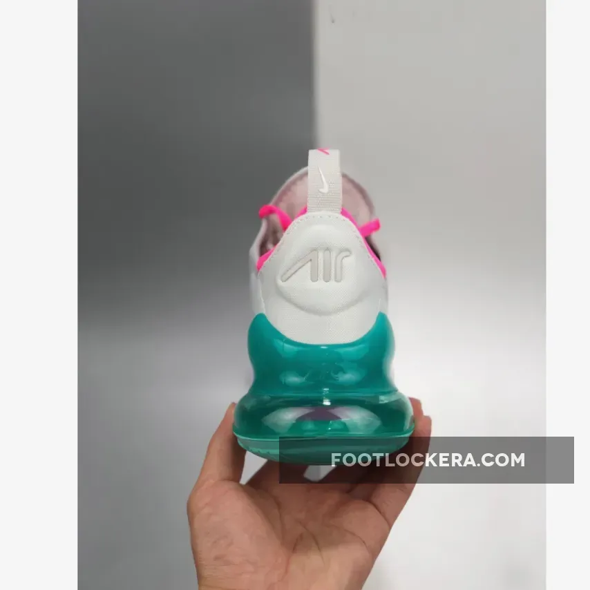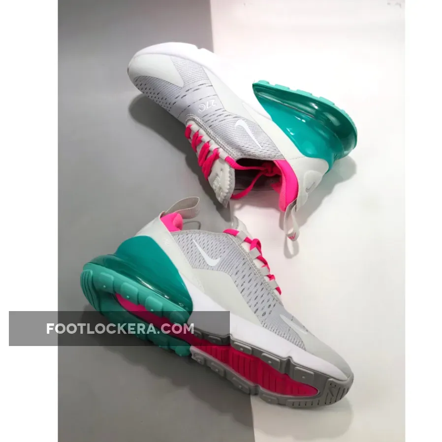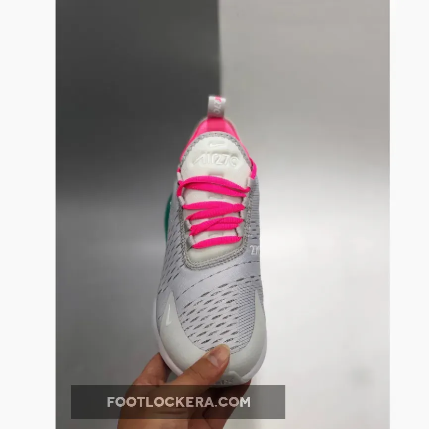 The Air Max 270 Pure Platinum Pink Blast delivers striking aesthetics with its clean design and vibrant accents. The light grey mesh upper provides a breathable and flexible base, while the pink/teal neons on the laces and Air cushioning add a tropical touch. Comfort is top-notch with Max Air and forefoot foam. Perfect for stylish strides. #NikeAirMax #SouthBeachVibes