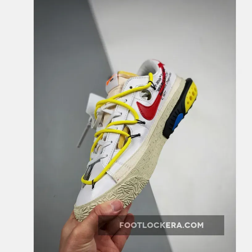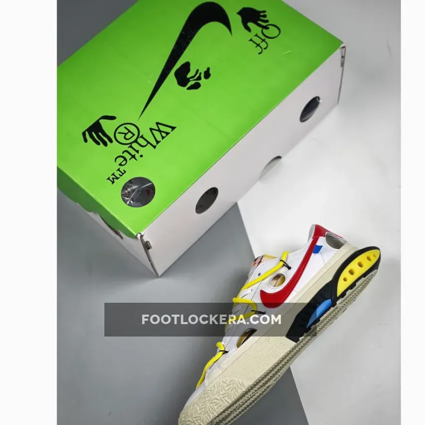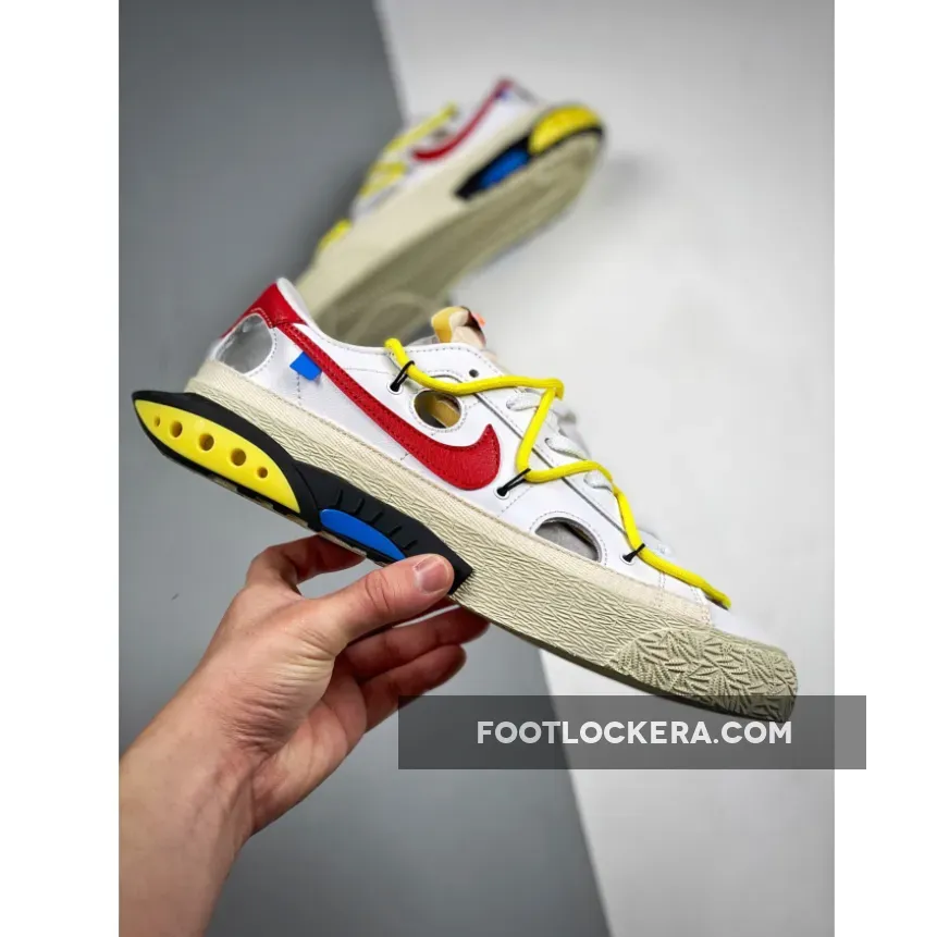 In true Off-White fashion, this collaborative iteration of the Nike Blazer Low is equipped with features that include the overlapping laces, the text on the sides, circular cutouts, yellowed midsoles, a retooled heel piece with foam at the rear, plastic inserts, and colored speckles. This colorway opts for a White leather upper, Red accents on the Swoosh and heel tab and canvas overlays on the mudguard region.