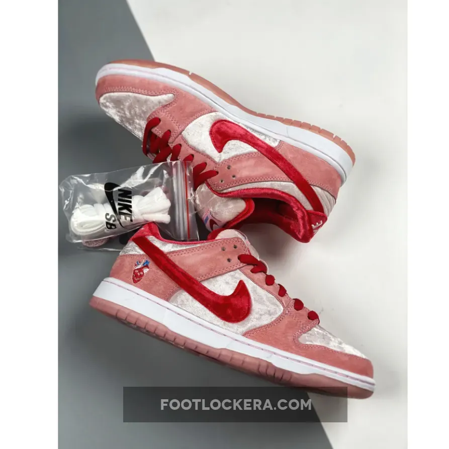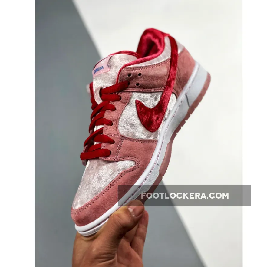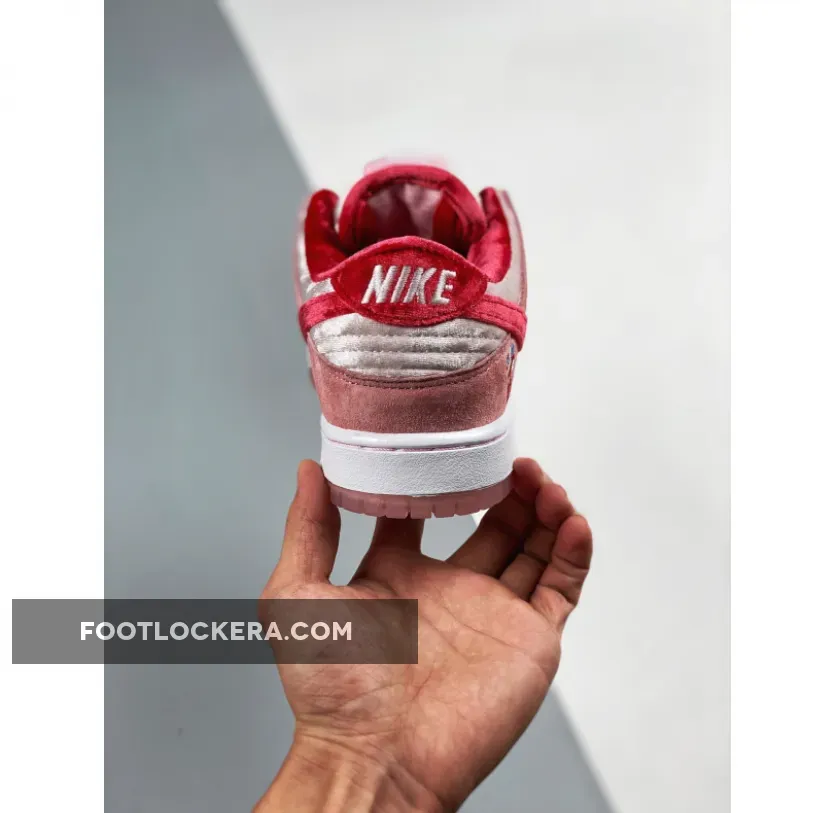Made in collaboration with Sean Cliver’s skate brand, the StrangeLove x Dunk Low SB QS ‘Valentine’s Day’ celebrates the romantic holiday with a plush take on the retro silhouette. The upper is constructed from white crushed velvet with pink suede overlays and a red velvet Swoosh.