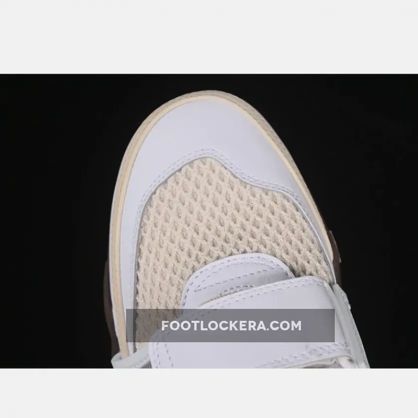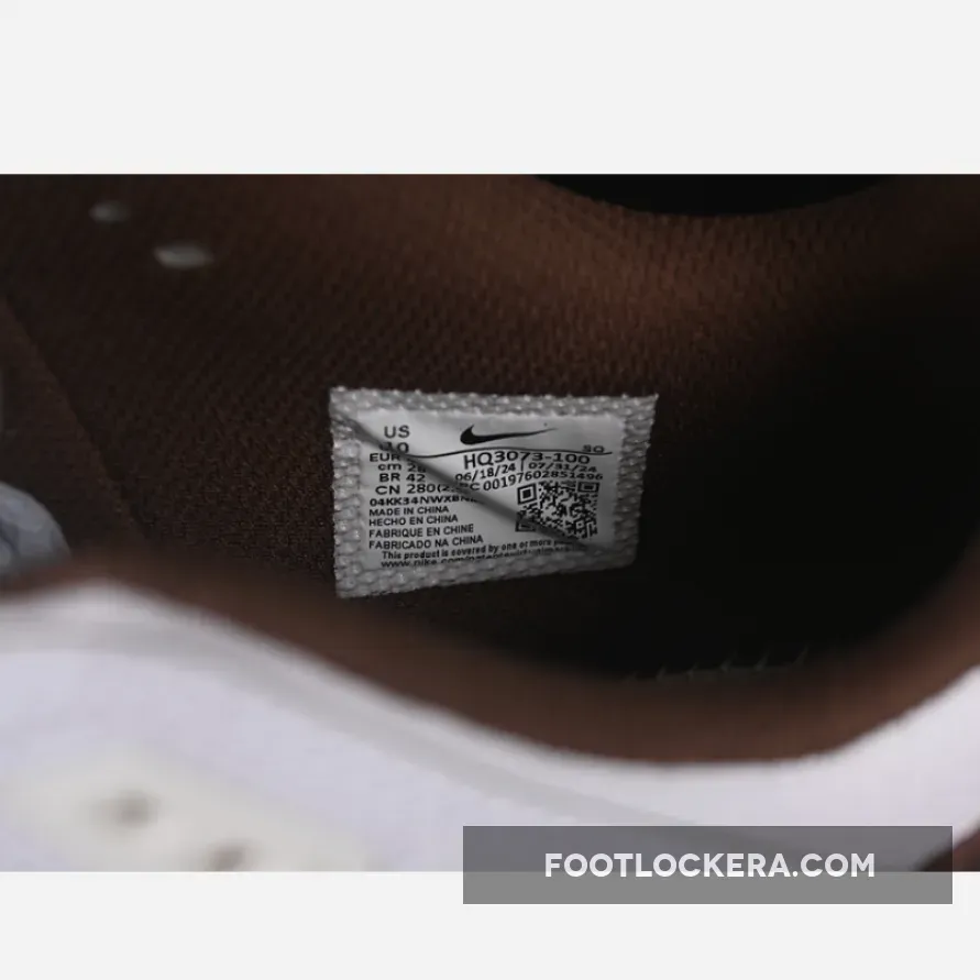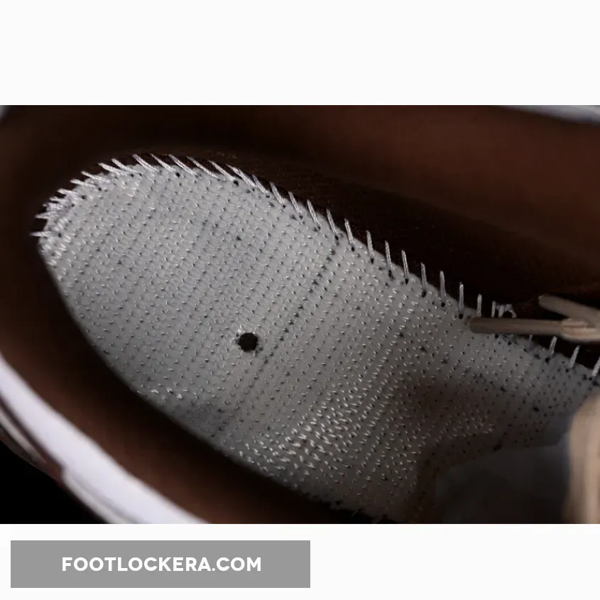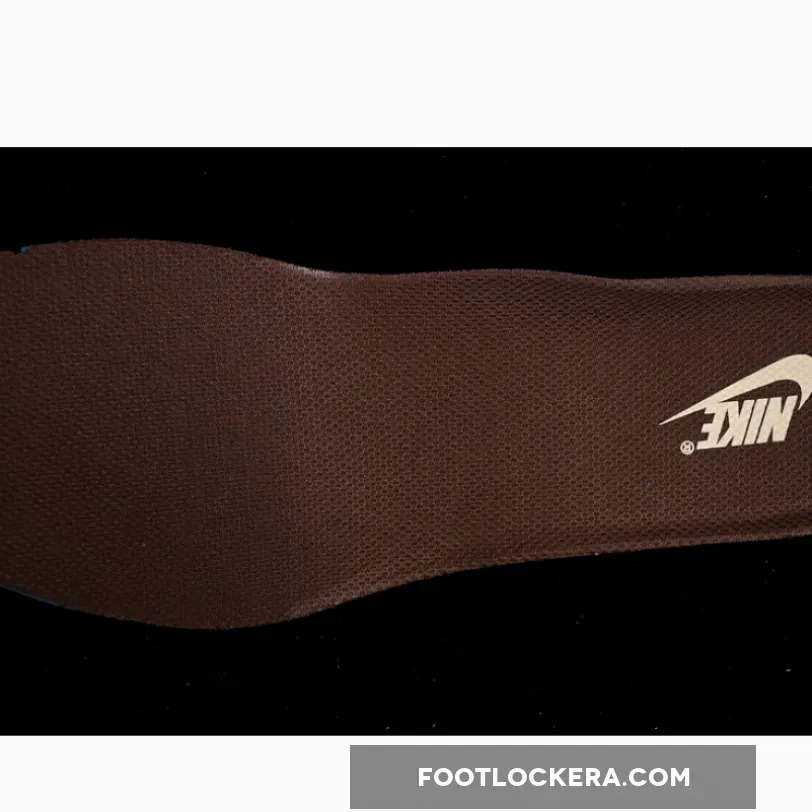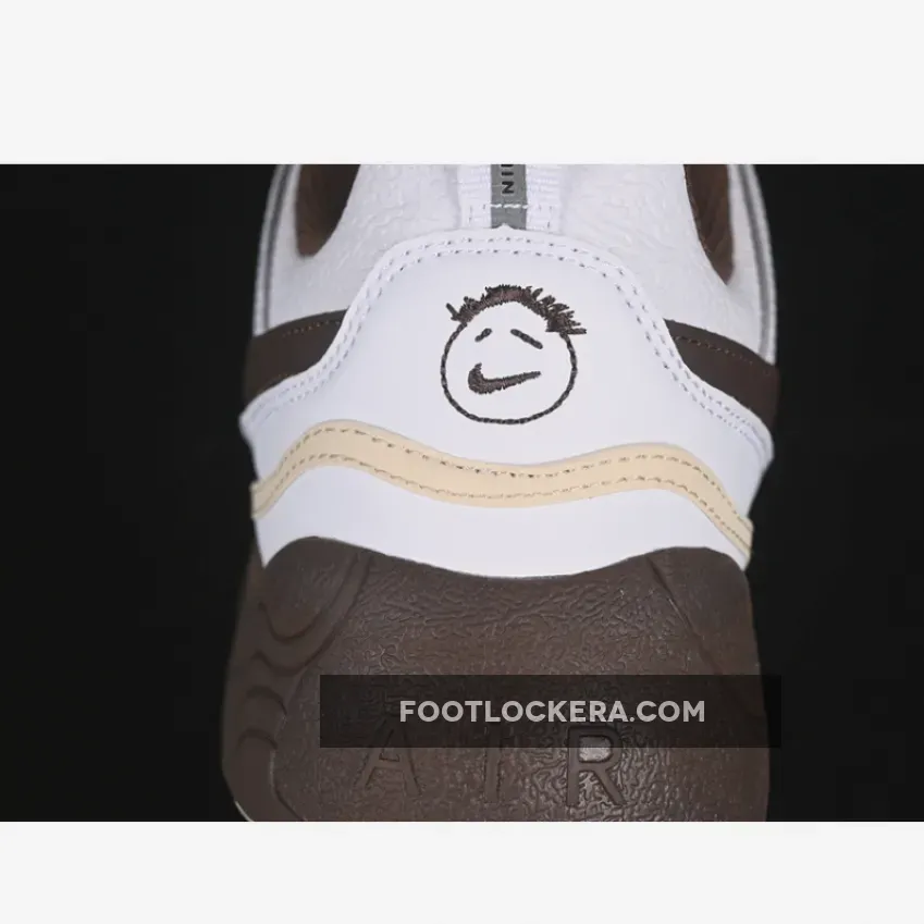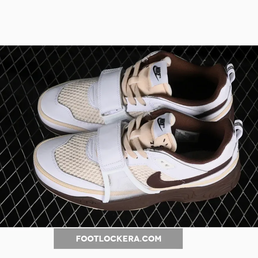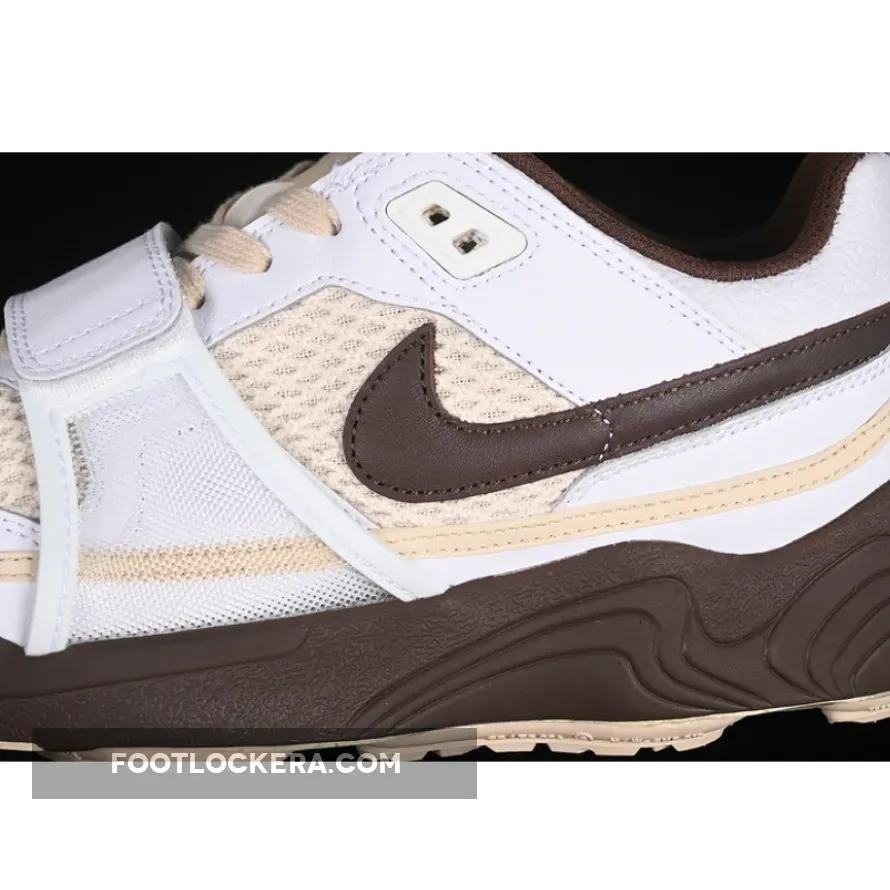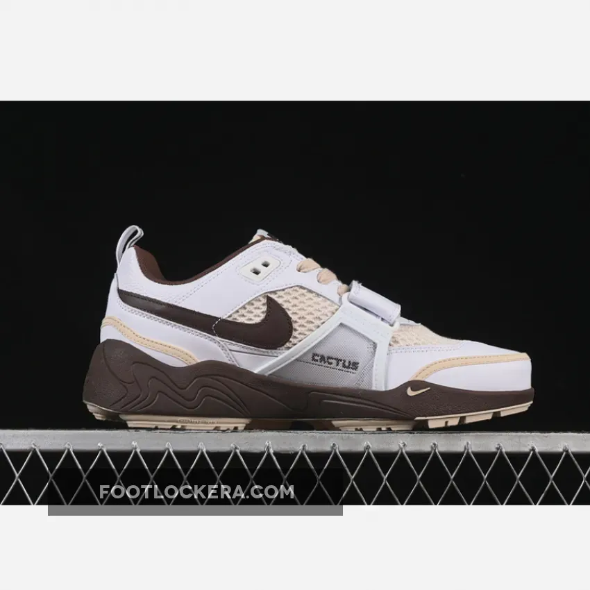 The Travis Scott x Nike Zoom Field Jaxx showcases a harmonious blend of light chocolate brown accents against crisp white panels, creating a visually striking contrast on its sleek silhouette. The upper is adorned with textured overlays that add depth while maintaining breathability—a testament to both form and function. The iconic Nike swoosh proudly sits at center stage atop the midfoot strap, ensuring it remains unmistakably recognizable amidst this modern design language.