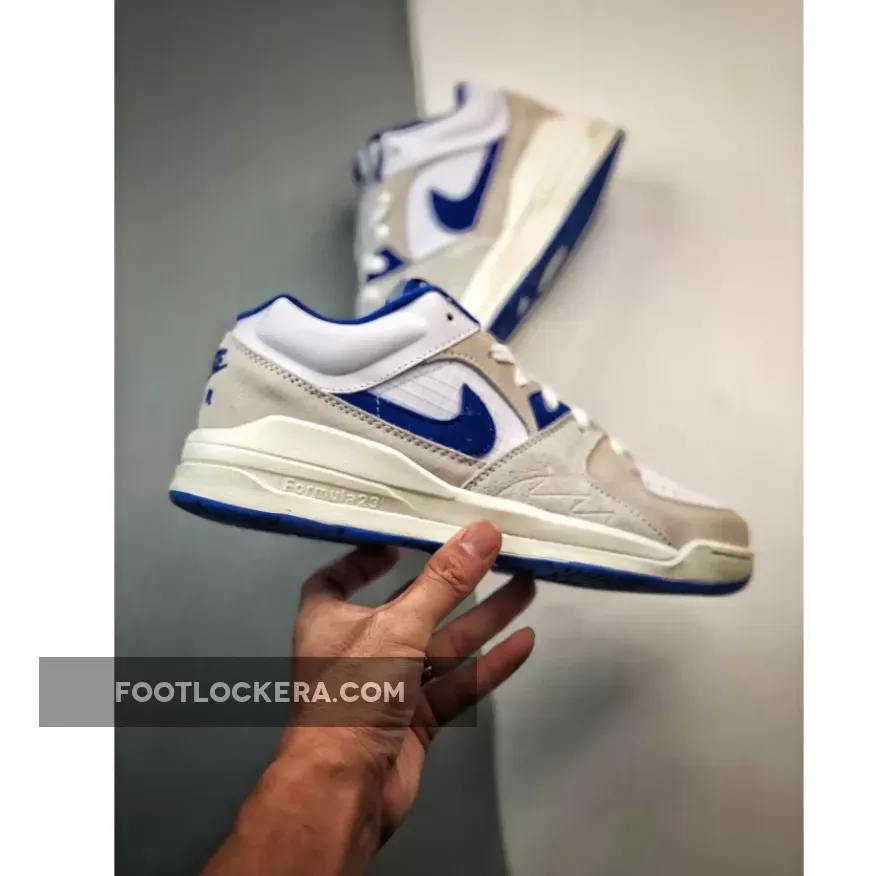 Much like its status-exclusive “Black/White” effort and Spring’s “Lucky Green” treatment, the low border runs a basic mix of neutrals at its base. Crisp white shades illuminate the ribbed ripstop midfoot window while providing other colorless accents to the smooth leather upper and laces. Elsewhere, the surrounding suede overlays, bulbous collar and Formula 23 midsole inject a repeating assortment of “Sail” shades while the suede profile swooshes, inner lining, heel logo and tread achieve a bright blue compliment.