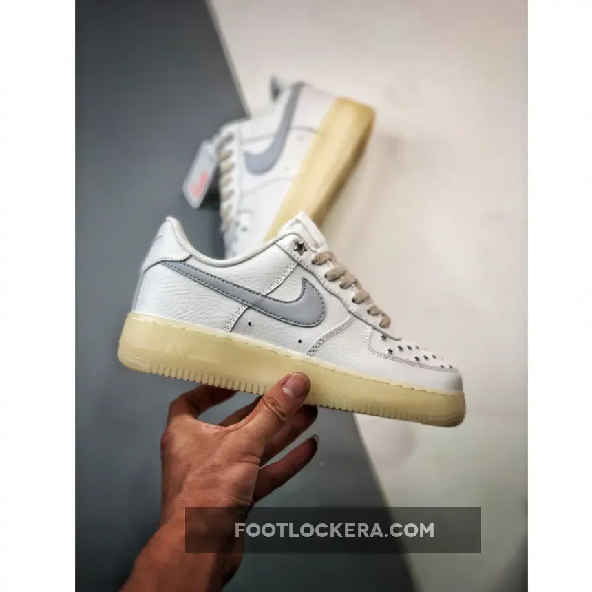 Minimalistic yet playful at the same time, the Nike Air Force 1 Low Star Cut-Out Pure Platinum gives you the best of both worlds. Its youthful design sees the classic AF1 decked in a lovely pale robin blue shade and designed with star-shaped perforations at the toe. The tumbled leather upper also goes well with the yellowed laces that give off a vintage vibe.